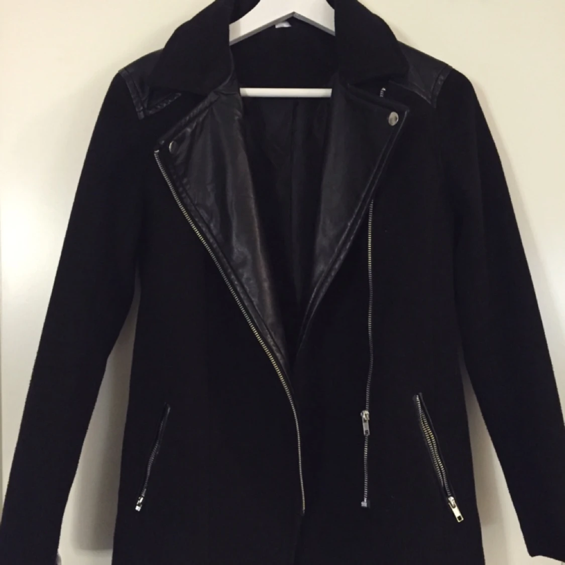 Black wool coat with "leather" details from H&M. Barely used because of wrong size. Priset går att diskutera. Tar Swish-betalningar.