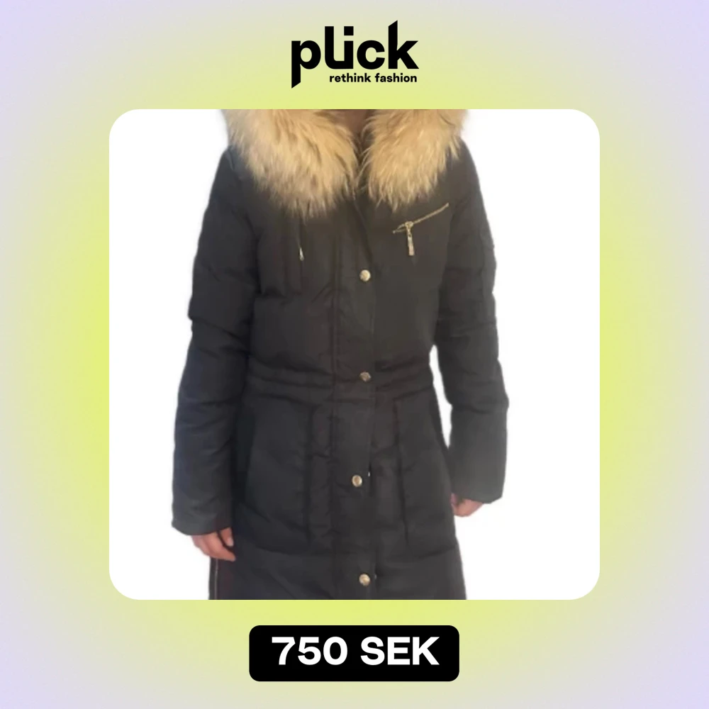 Svart, figursydd dunjacka i längre modell från Hollies. Luva med avtagbar pälskrage. Dold mudd i ärmslut I storlek 34.