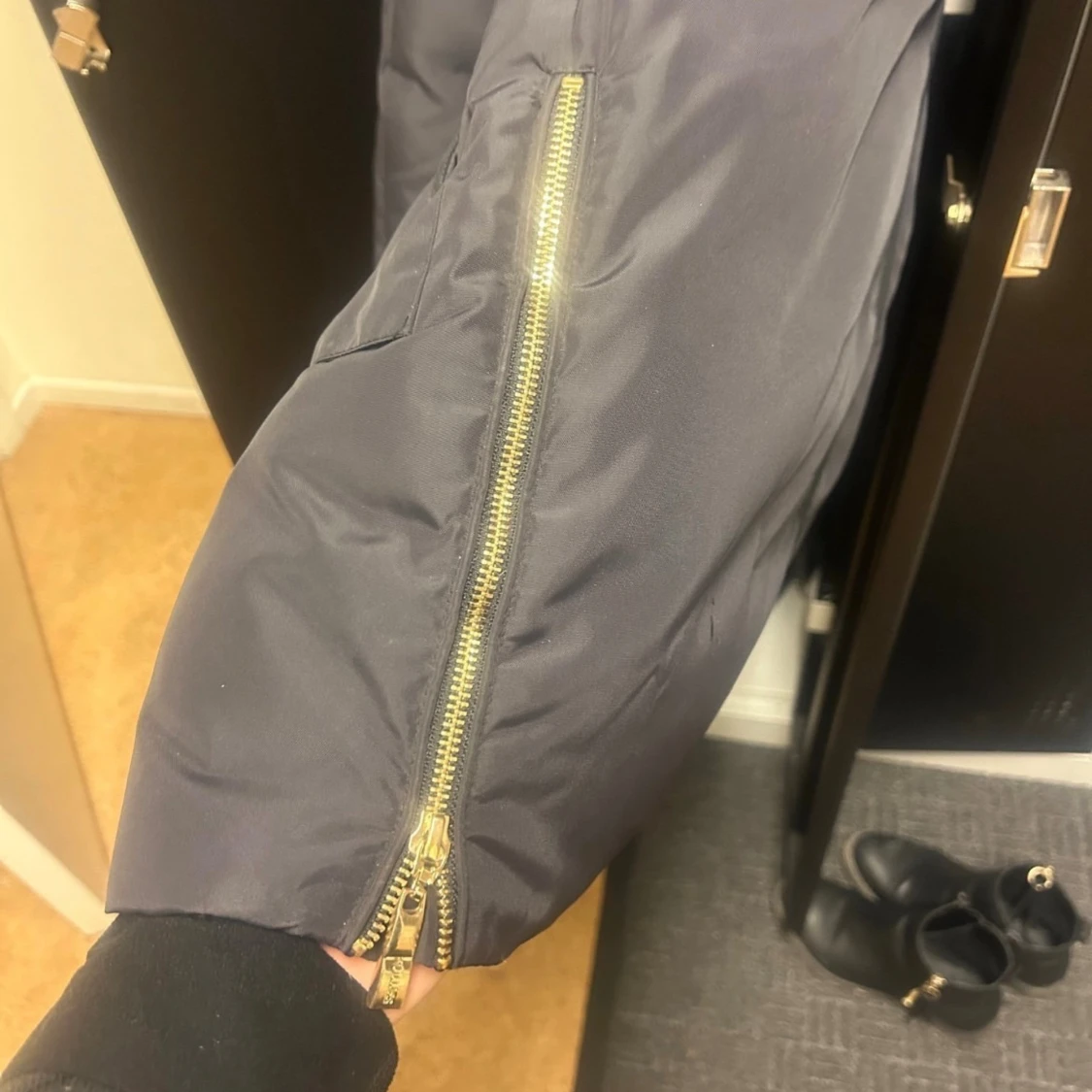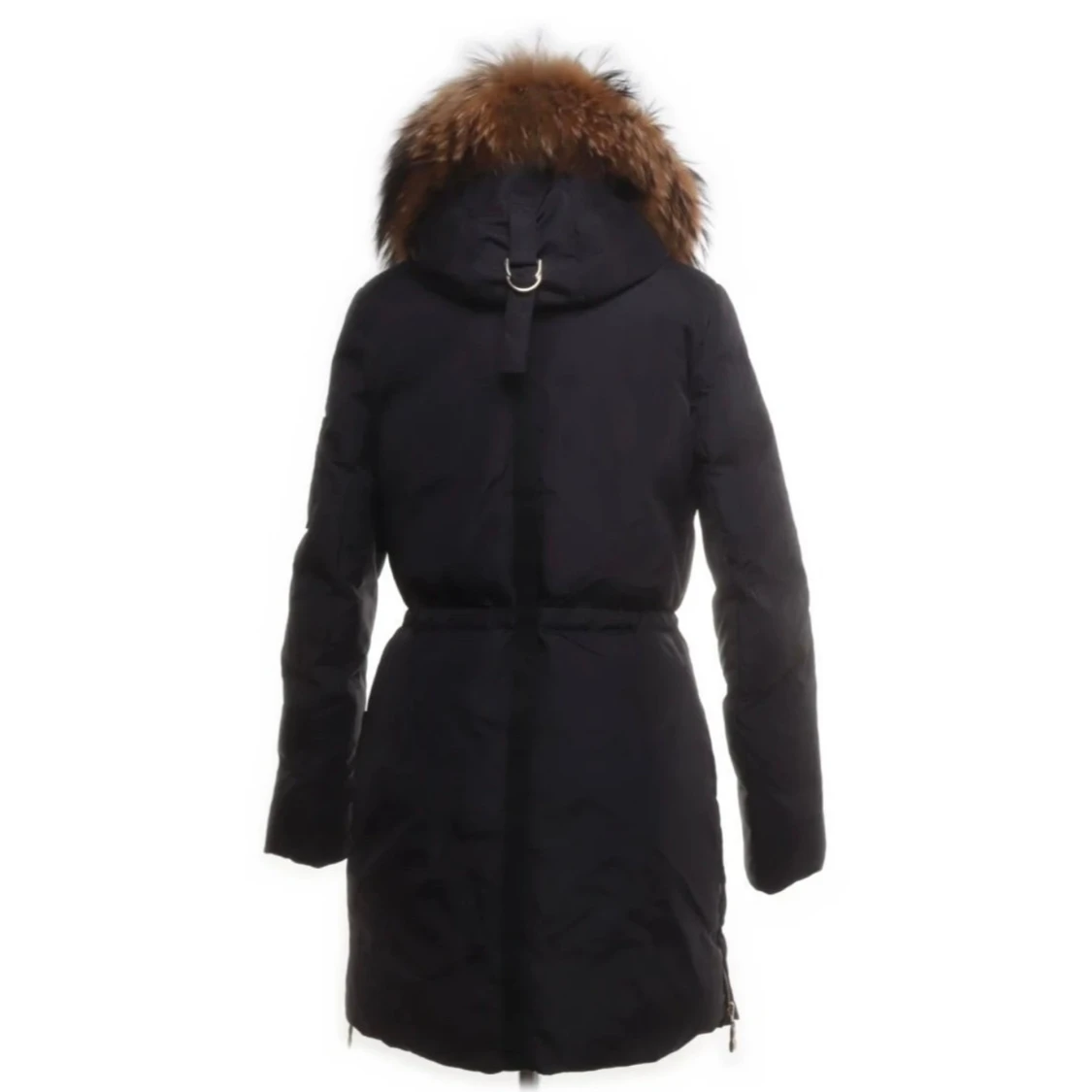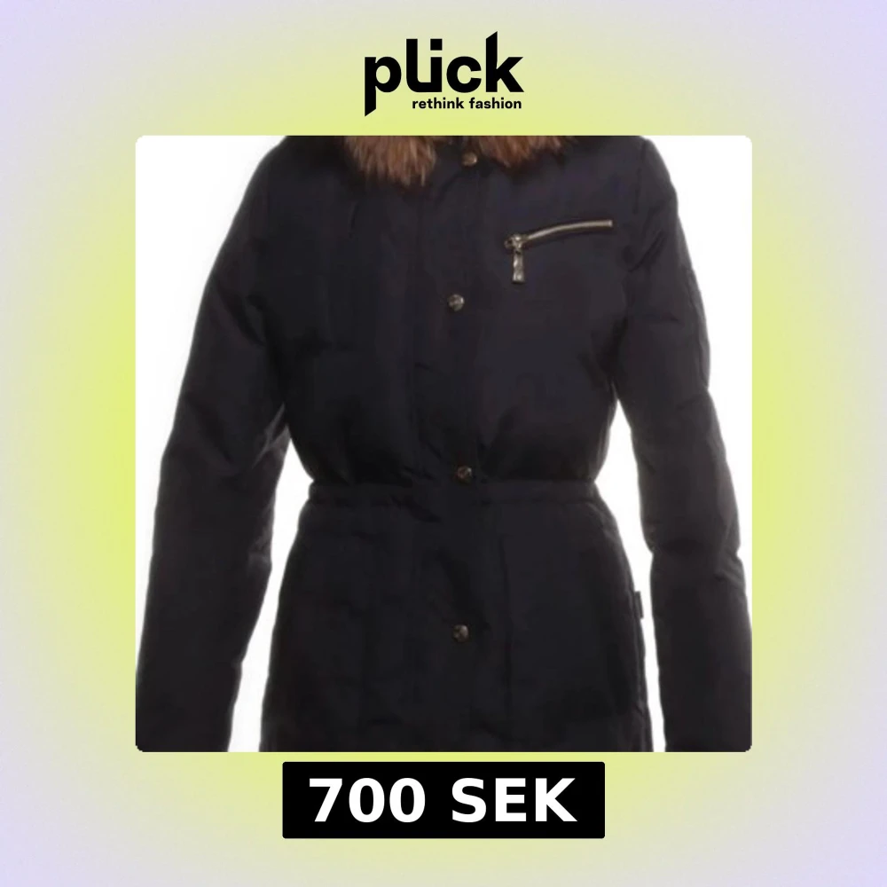 Snygg svart dunjacka från Woolrich med lång passform och fluffig brun päls runt huvan. Jackan har dragkedja och knappar framtill, en bröstficka med dragkedja och markerad midja. Perfekt för kalla vinterdagar när du vill hålla stilen.