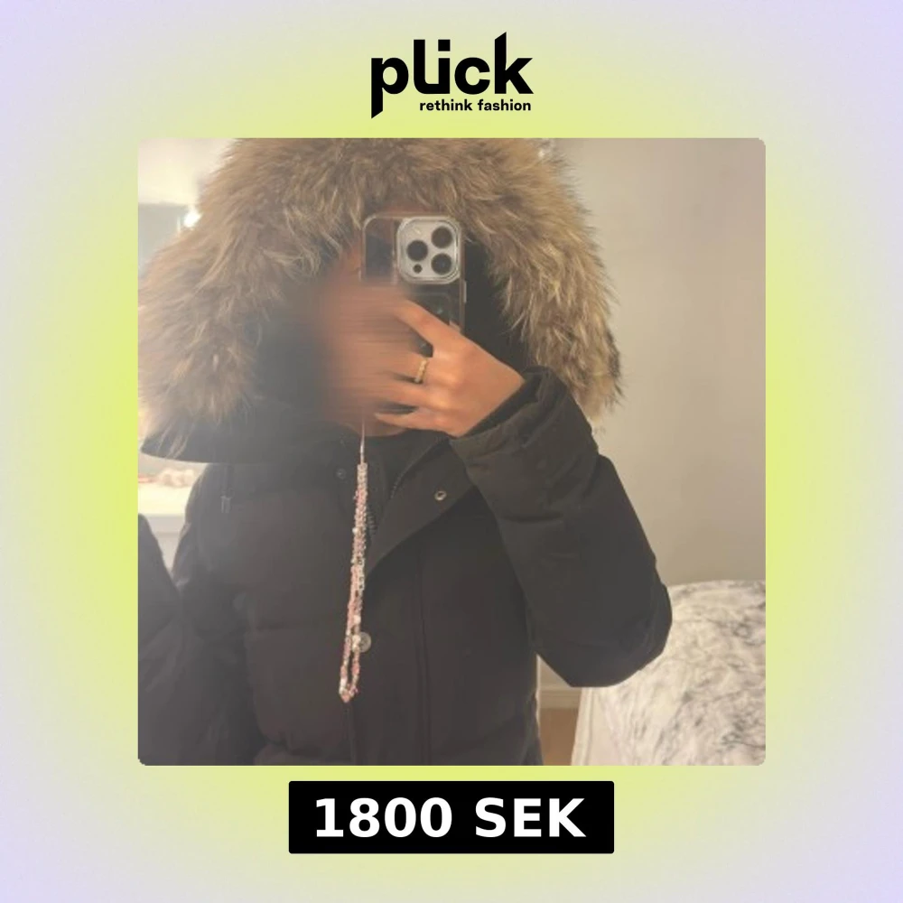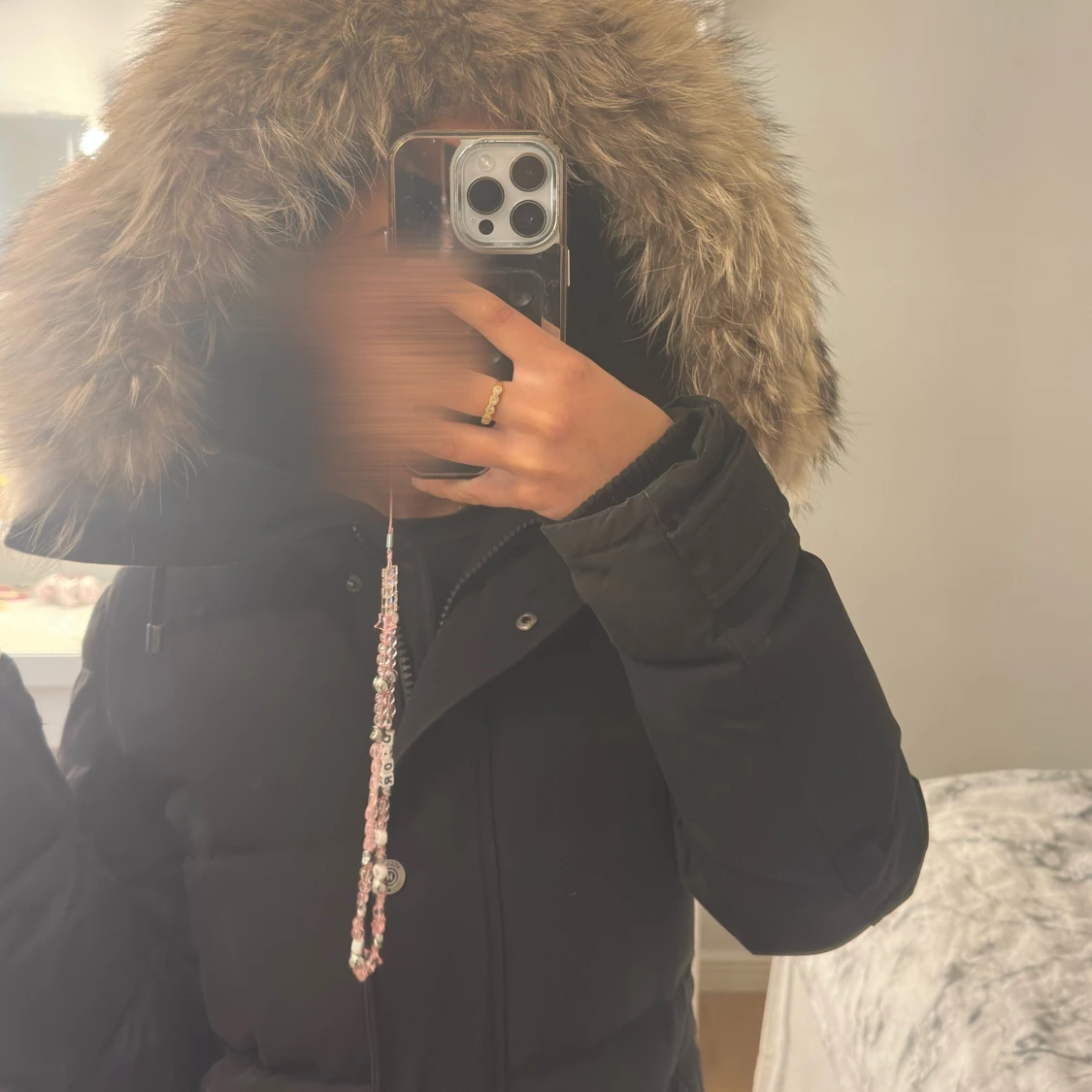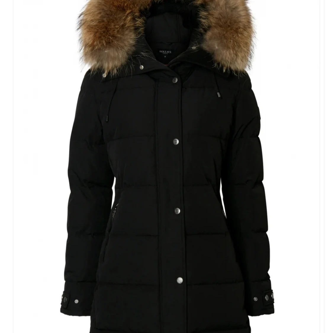 Snygg svart dunjacka från Hollies med stor fluffig pälskantad huva. Jackan har långa ärmar, dragkedja och knappar framtill samt markerad midja. Perfekt för kalla dagar och ger en riktigt stilren look.