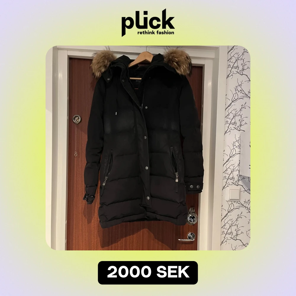 Den är i bra skick, har använts varje vinter i 3 år. Den är lite sliten men inget som syns jättemycket. Märket saknas tyvärr då den åkt av :( Extra knappar finns, äkta päls. Inga hål eller så, den är i dun. Köptes för 3500kr Skriv för fler foton