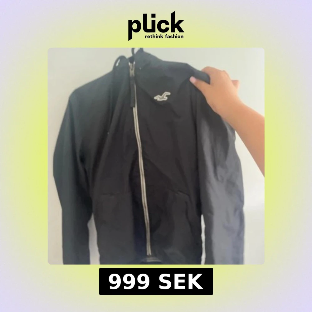 Svart vindjacka från Hollister med vit logga på bröstet och hel dragkedja framtill. Jackan har huva med snörning och två fickor. Materialet är lätt och syntetiskt, perfekt för blåsiga dagar. Stilren och enkel design som funkar till många outfits.