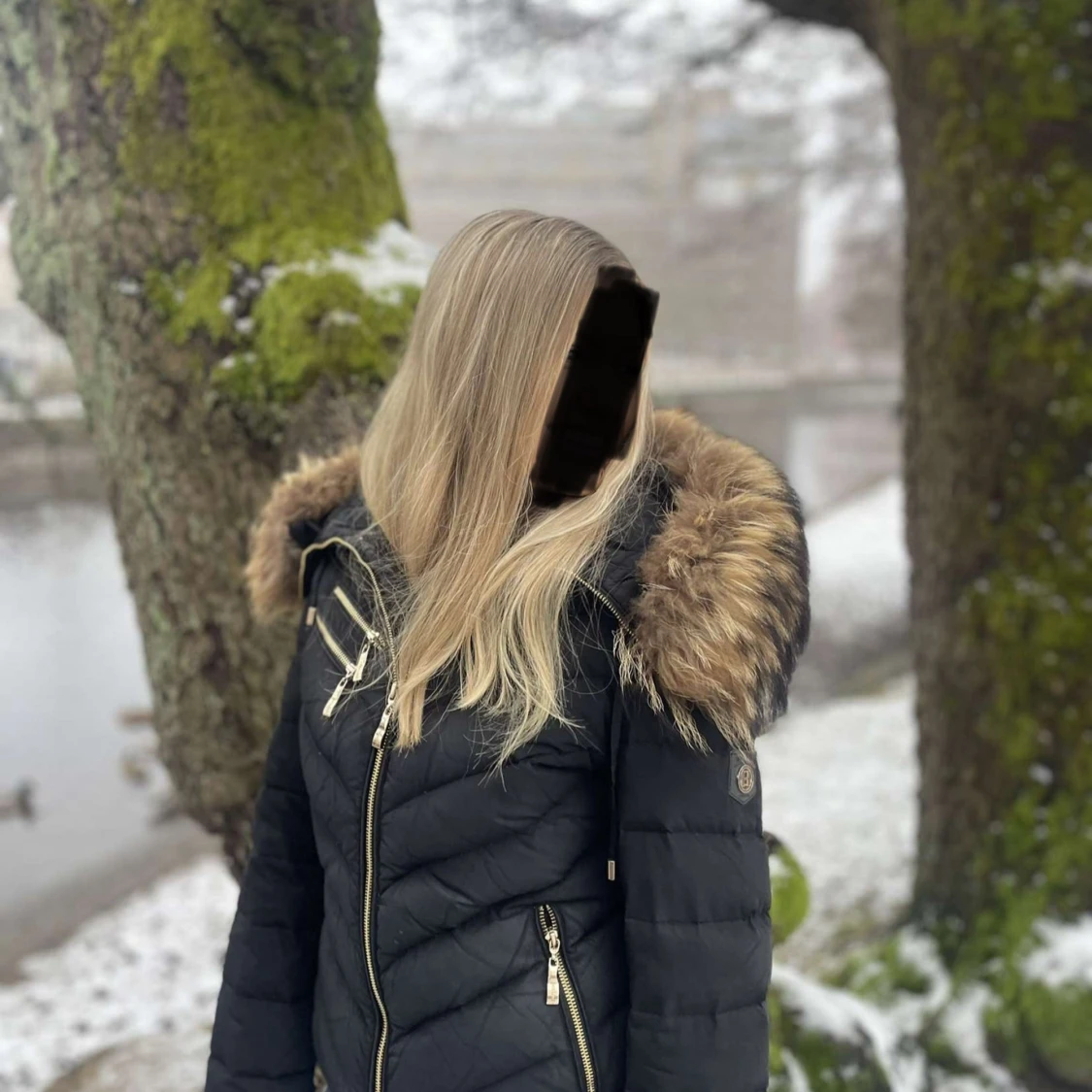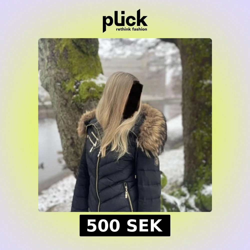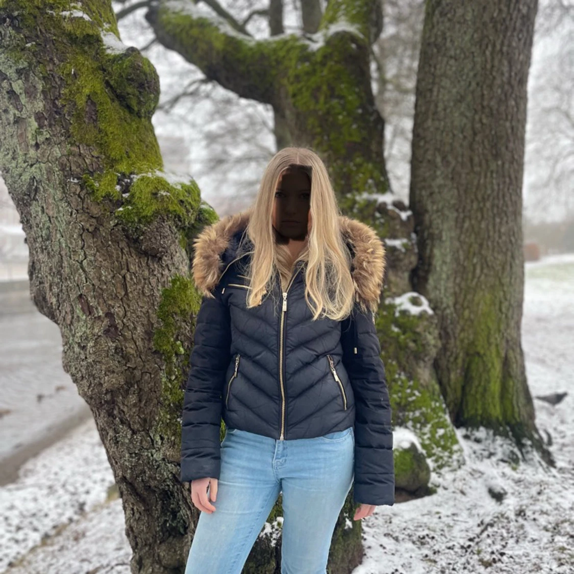 Snygg svart pufferjacka med fluffig pälsimitation runt luvan och guldfärgade dragkedjor. Jackan har quiltad design, lång ärm och flera fickor med dragkedja. Perfekt för kalla dagar och ger en cool vibe till din outfit.
