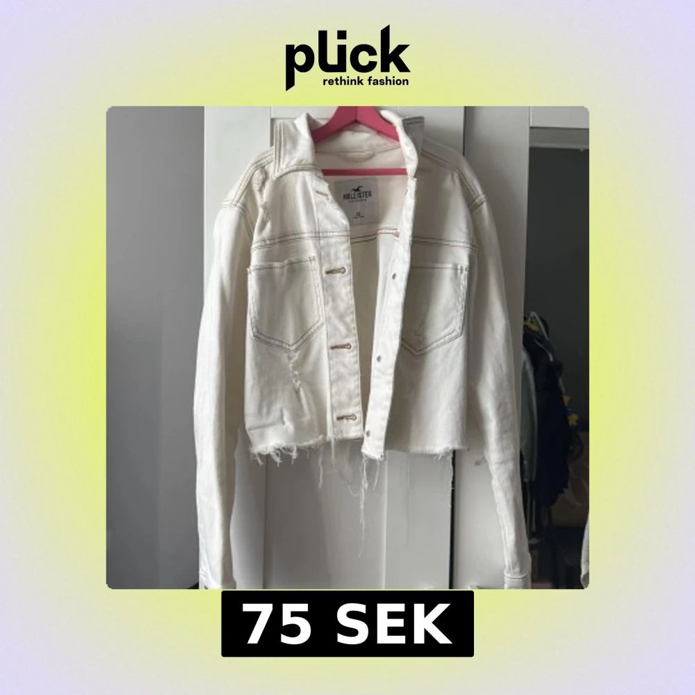 Säljer en vit croppad jeansjacka från Hollister med rå, fransig nederkant och snygga kontrastsömmar. Jackan har två bröstfickor, knappar framtill och klassisk krage.