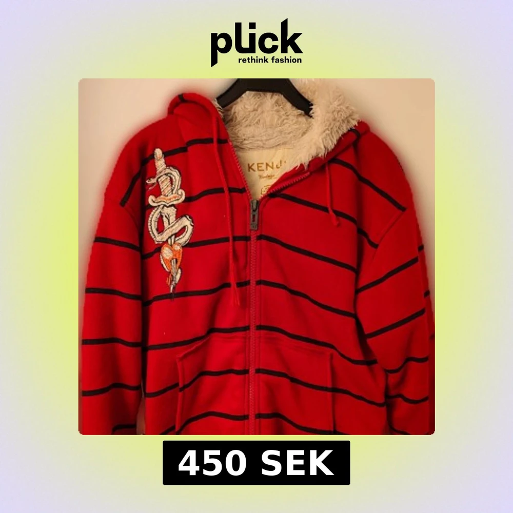 Röd hoodie med svarta ränder från Kenji. Jackan har dragkedja, huva med fluffigt foder och broderade motiv av orm och drake. Perfekt för dig som gillar unika detaljer och streetwear-stil. Skön, stor & varm hoodie i bra skick.