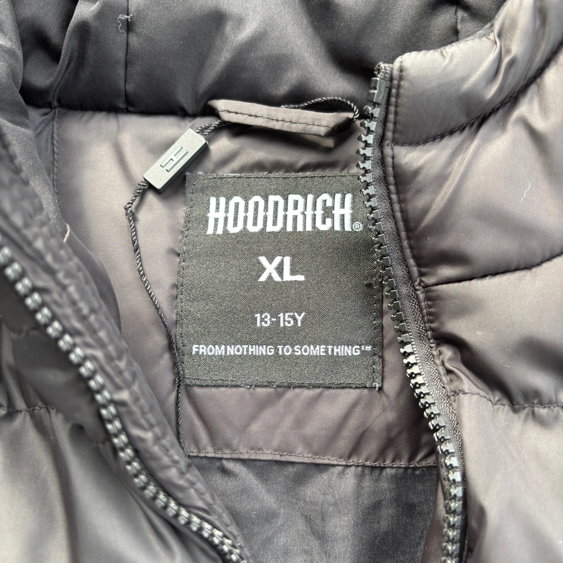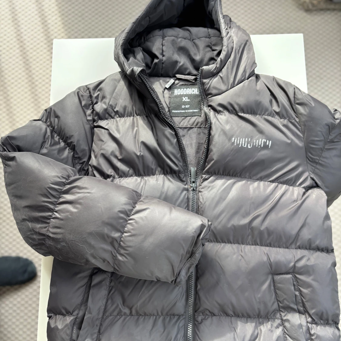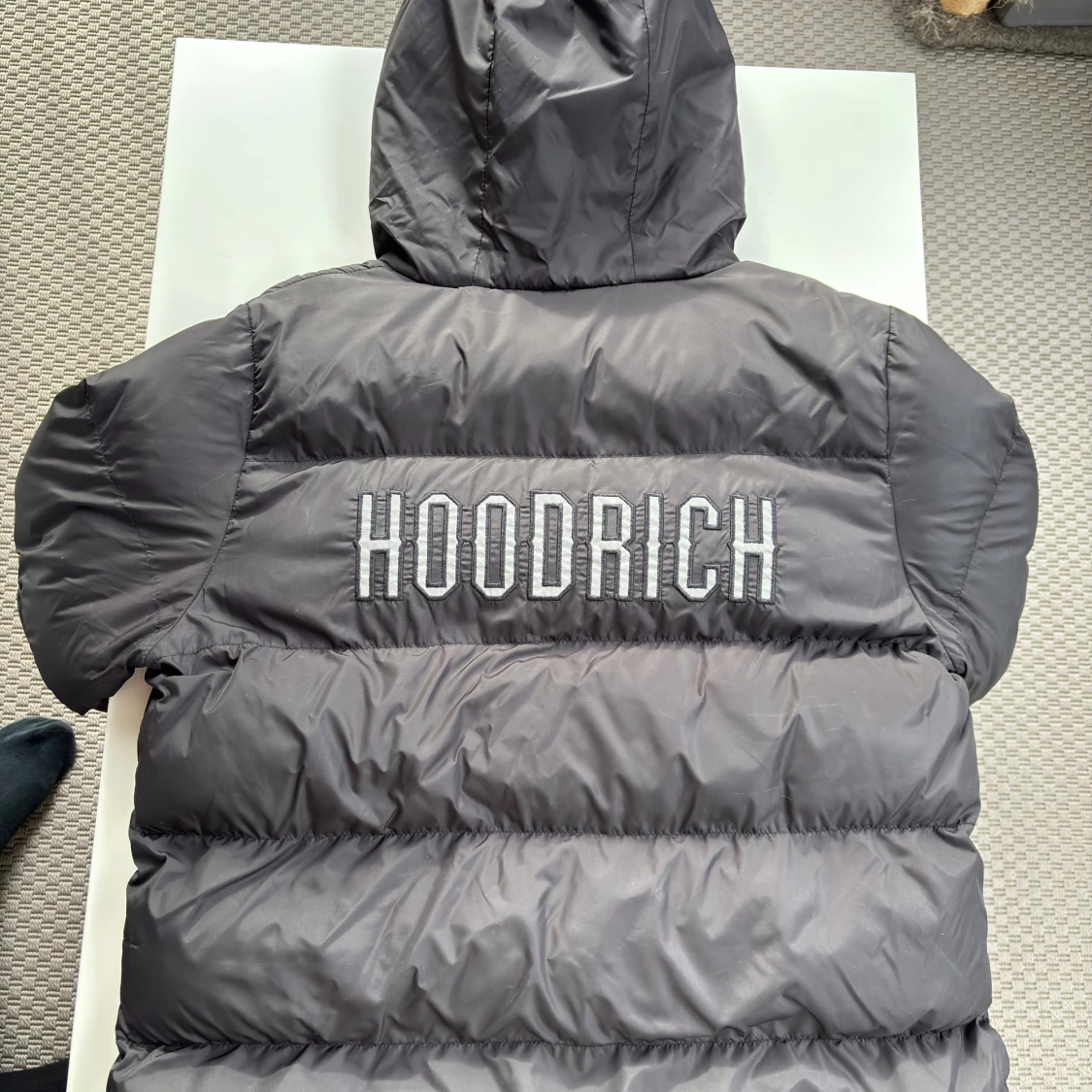 Svart pufferjacka från Hoodrich med stor broderad logga på ryggen och mindre logga på bröstet. Jackan har huva, dragkedja framtill och två sidofickor. Tillverkad i syntetmaterial och perfekt för kalla dagar.