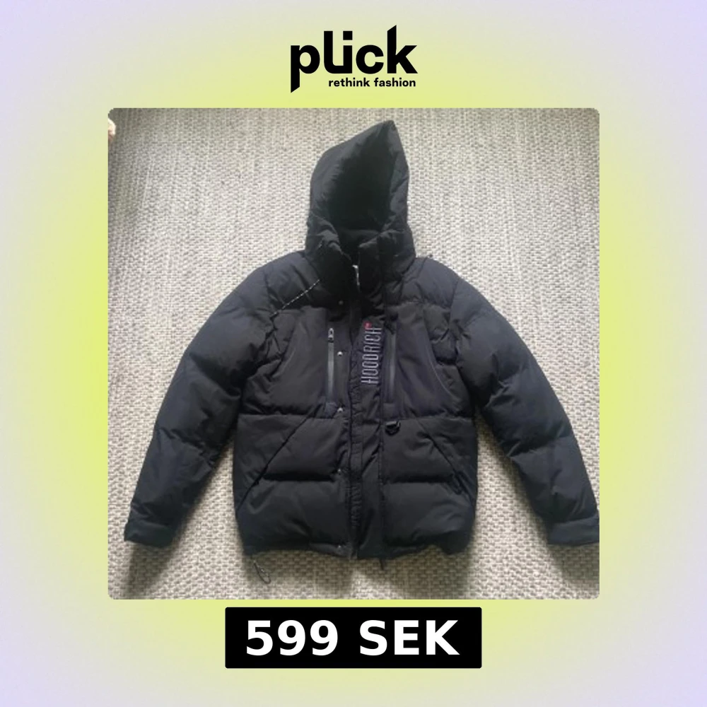 Svart pufferjacka från Hoodrich med huva och tryck på både bröst och rygg. Använd en gång helt nyskick riktigt varm ock skön, storlek S men passar även M.
