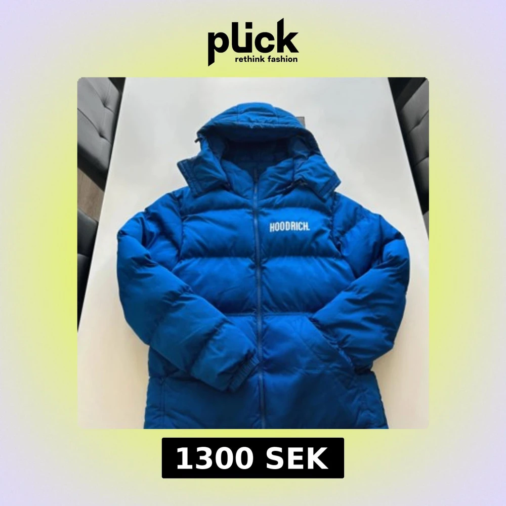 Säljer en blå pufferjacka från Hoodrich med broderad logga på bröstet och ryggen. Jackan har en dragkedja framtill och långa ärmar. Perfekt för kyliga dagar med sin varma och vadderade design.