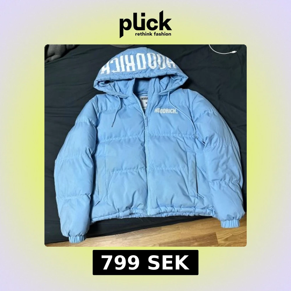 Säljer en ljusblå pufferjacka från Hoodrich i storlek XS men det passar för S eller M. Jackan har huva med stor vit logga, dragkedja framtill och två fickor. Perfekt för kalla dagar i sverige.