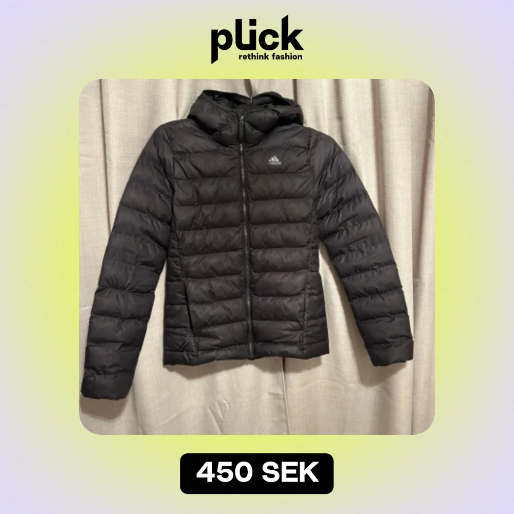 Säljer en svart dunjacka från Adidas i storlek XS. Jackan har en dragkedja framtill och en huva med tre ränder. Perfekt för kyliga dagar med sin quiltade design som håller värmen. Den är i nyskick och redo för höst- och vinteräventyr!