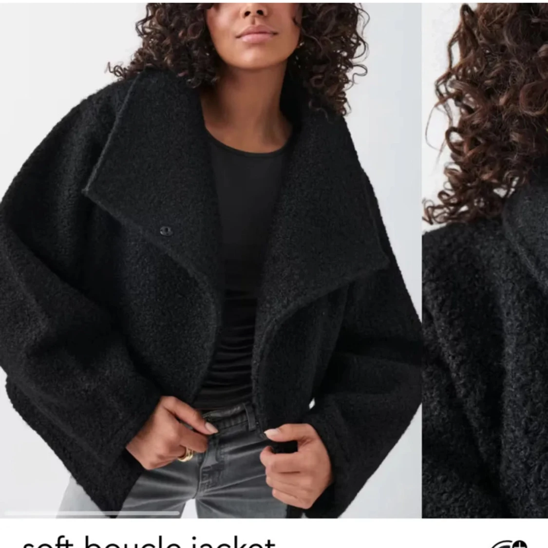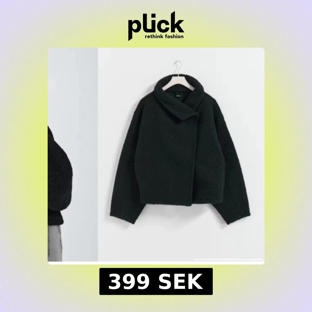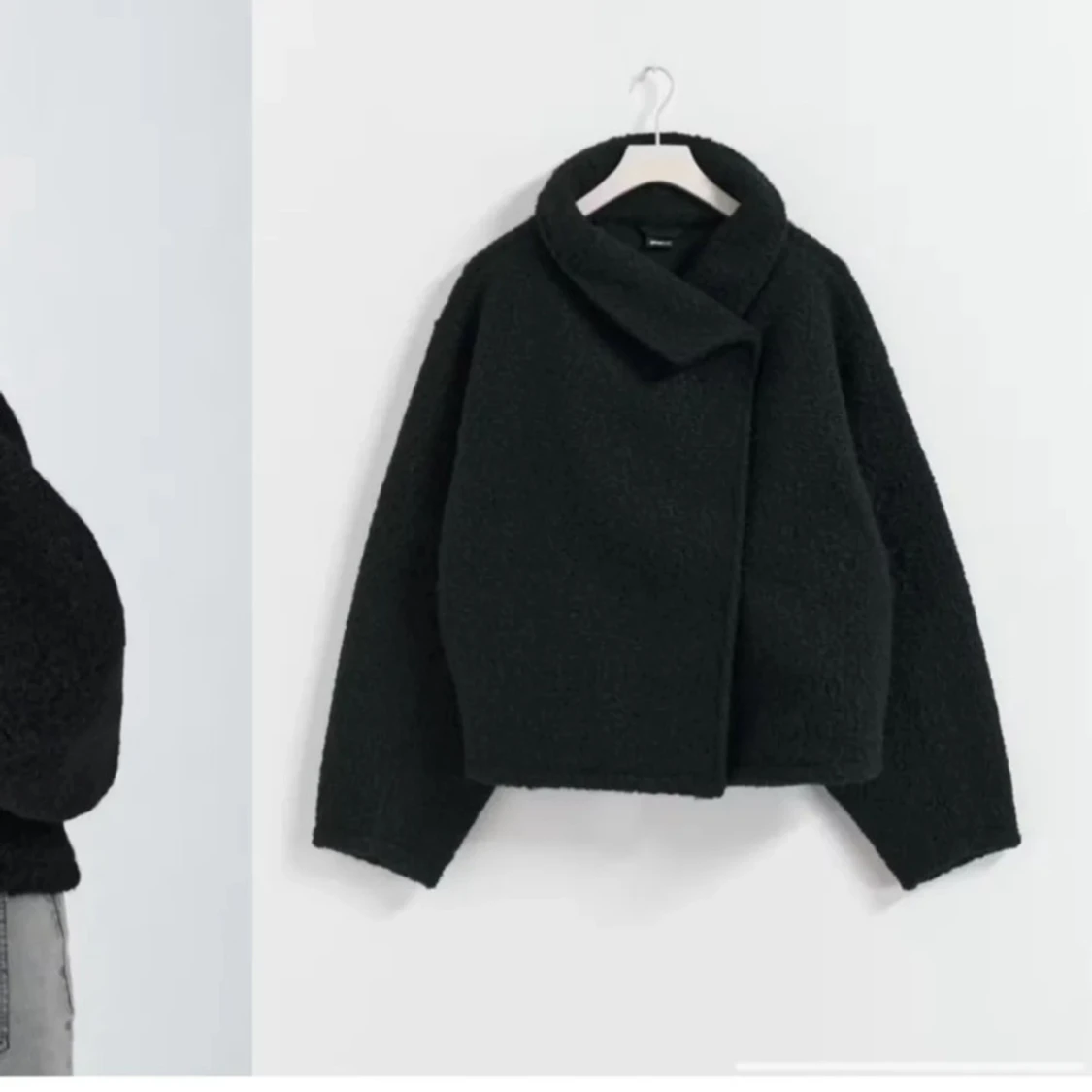 Säljer en stilren svart boucléjacka med en oversized passform. Jackan har en stor krage och knäppning framtill. Perfekt för att hålla sig varm och trendig under kyligare dagar.