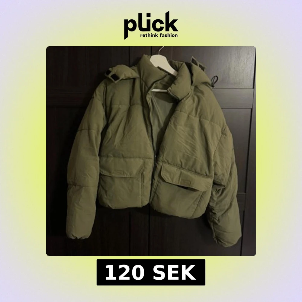 Säljer en olivgrön pufferjacka i storlek XS. Jackan har en croppad passform, stora fickor framtill och dragkedja. Perfekt för kalla dagar med sin vadderade look och höga krage. Snygg och trendig modell som håller dig varm.