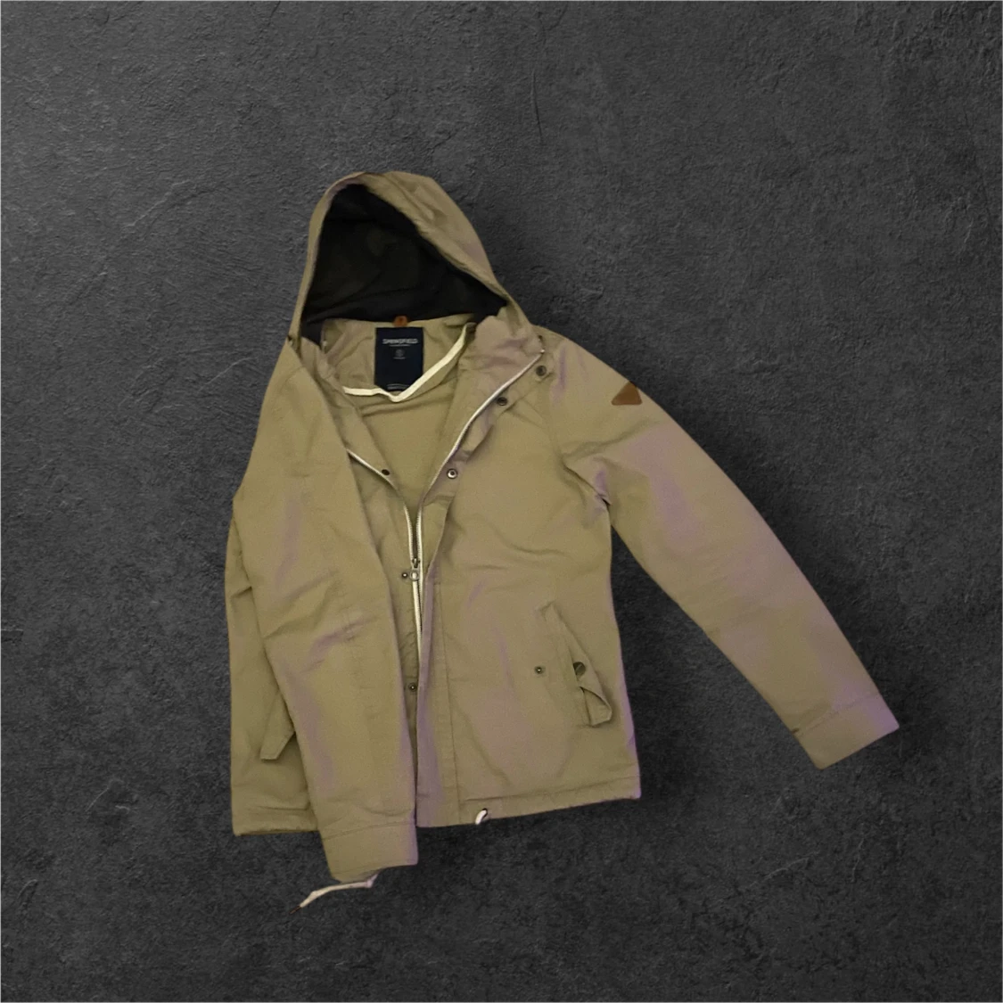 En beige windbreaker ifrån Springfield i storlek S, perfekt inför våren och eftersom den är beige är den enkel att stylea, den har gått loss vid snöret där nere åt vänster men inget som syns när man har på sig jackan