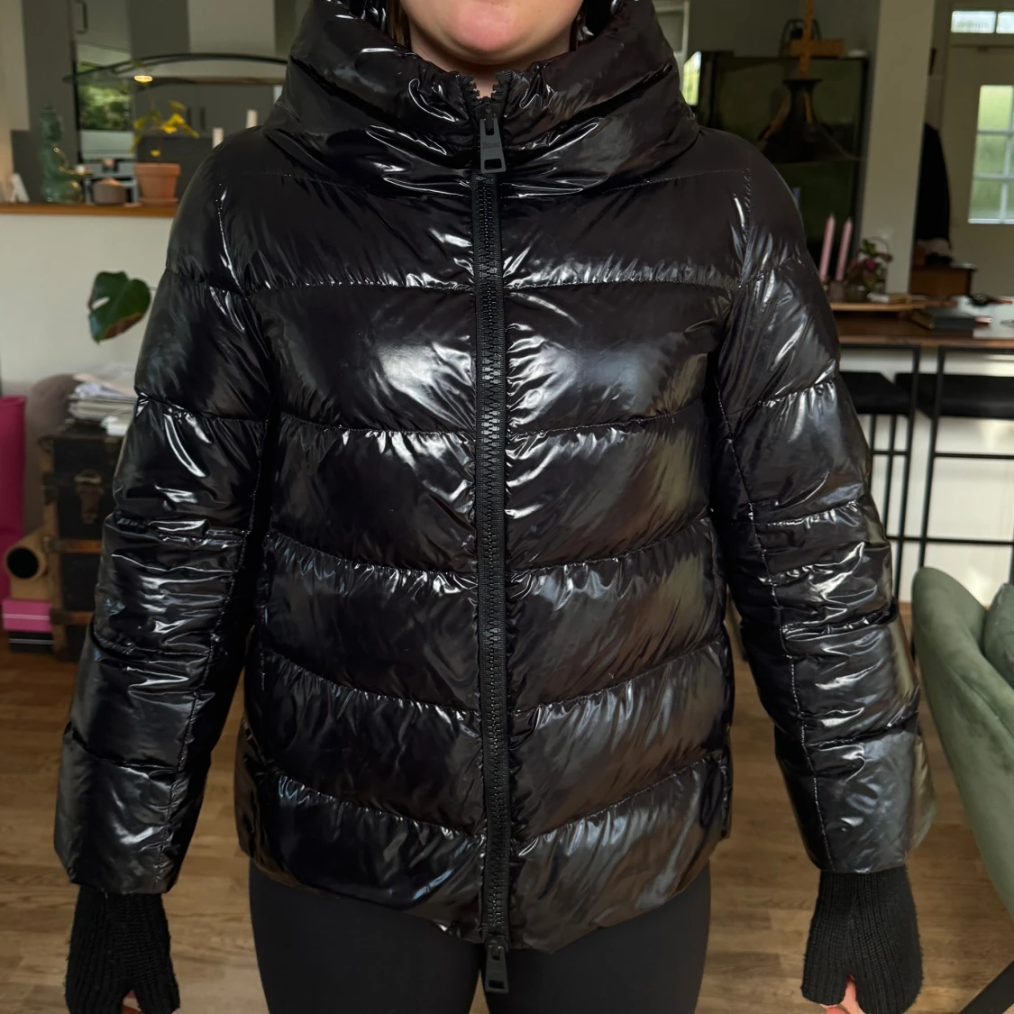 Säljer en svart, glansig pufferjacka från Herno med hög krage och dragkedja framtill. Cape made from iconic gloss fabric, whose lacquered effect brings out the radiance and modern style of the garment's colours. Water-resistant and boasting a functional modern shape, this garment will give your city wardrobe that Herno-signature upgrade. Regular fit High collar Two-way zip fastening Press stud-fastened pockets Goose down padding Står ej storlek men skulle säga Stl S Nypris 6200kr