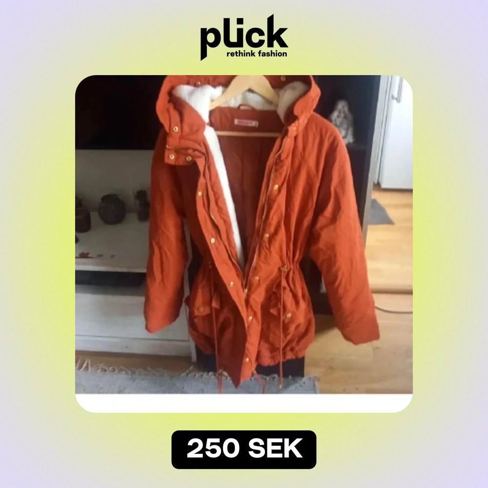 Brand röd-orange färgad höstjacka, den framhävs mer orange på bild än den är. Snören vid midjan och benen för att reglera hur åtsittande den ska vara. Använd 1 gång, skick är som ny. Fusk pälsen som fanns på luvan är dessvärre borta. Nypris 800:-