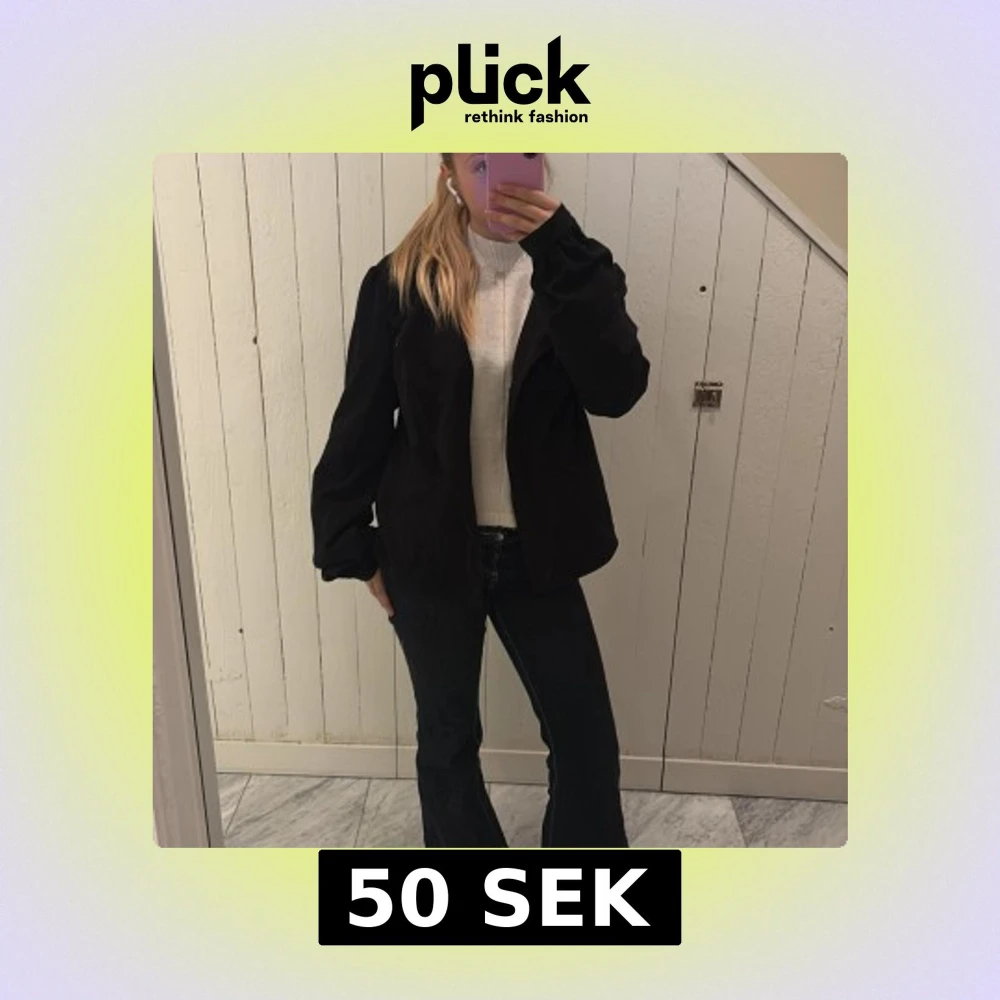 Svart jacka som saknar en knapp, den är i storlek 46 men skulle säga att det är som en M. Den är köpt secondhand och jag har använt den få tals gånger.