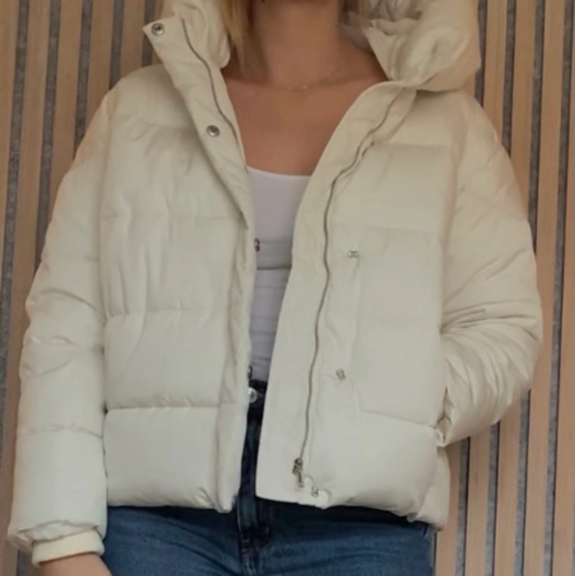 Vit trendig pufferjacka/vinterjacka från MANGO. Perfekt nu när det börjar bli lite kallare! Aldrig använd (lapparna är kvar!). Välgjord jacka i kvalité!! Har muddar vid ärmarna och snygga dragkedjor vid fickorna. Barnstorlek M, men passar mig, 171cm S/M