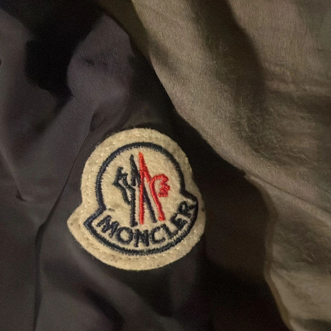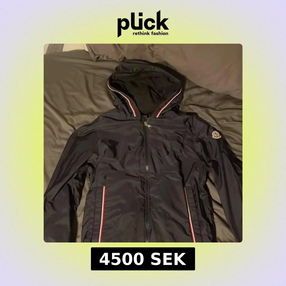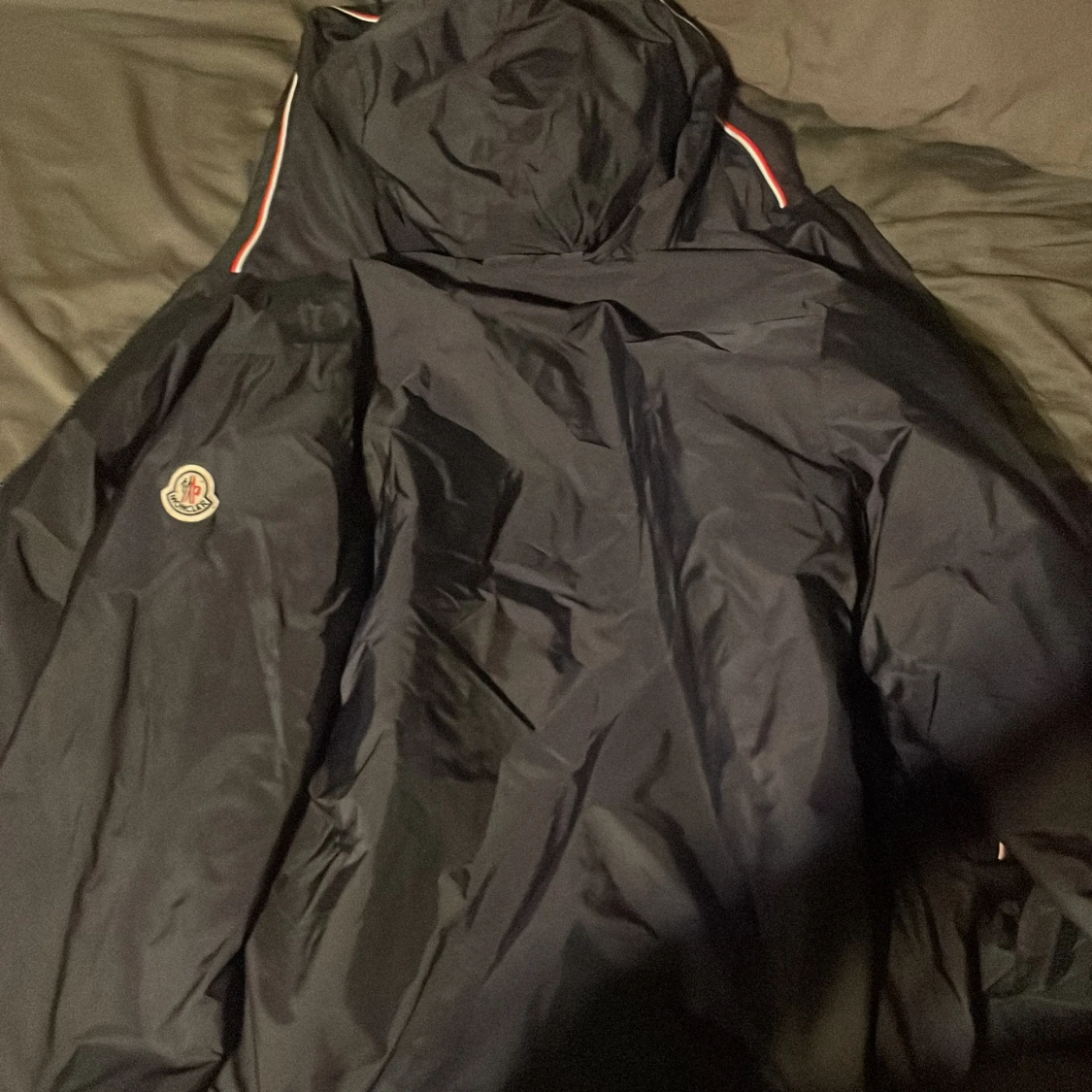 Mörkblå vindjacka från Moncler med huva och snygga rödvita detaljer längs dragkedjan och fickorna. Jackan har Moncler-logga på ärmen och hel dragkedja framtill. Perfekt för dig som gillar stilrena och sportiga plagg med exklusiv känsla. Köpt i Rom därav italiensk text på insidan. NFC Scan inuti jackan vid qr koden. Moncler Granduc. Og pris 6000 kr.