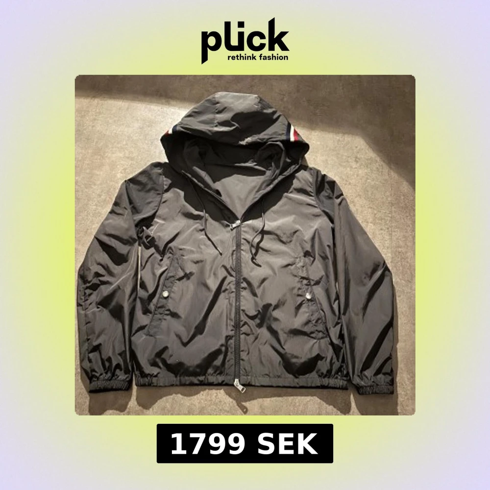 Grå vindjacka från Moncler med huva och dragsko, hel dragkedja framtill och två fickor med tryckknappar. Jackan har Moncler-logga på ena fickan och diskreta rödvita detaljer på huvan. Perfekt för dig som vill ha en stilren och sportig look. Hör av vid minsta fundering 💫