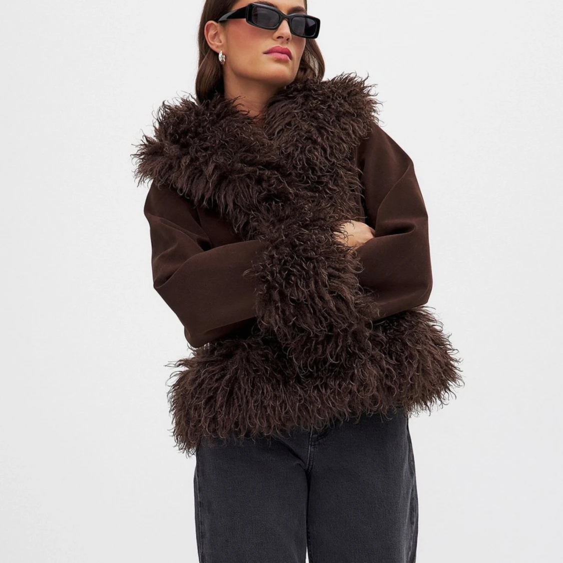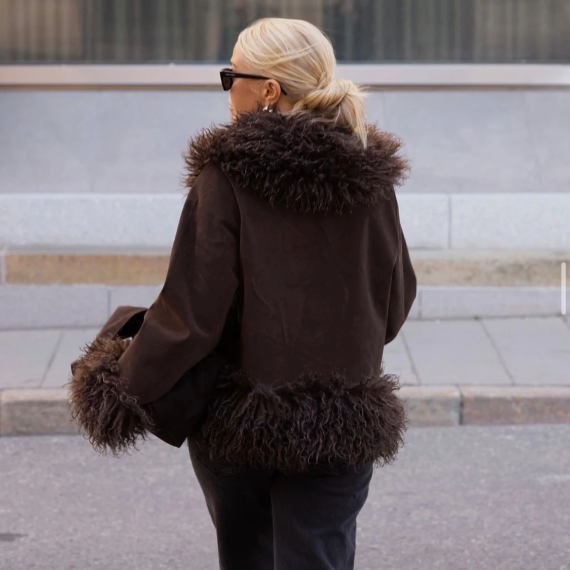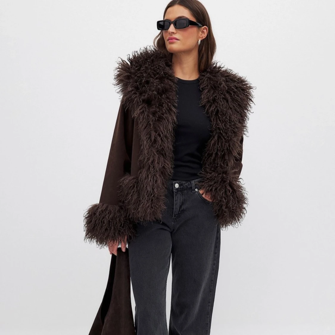 Säljer denna supercoola bruna mockajackan med pälsdetaljer från Moa Mattsson x NA-KD. Helt slutsåld och kommer inte komma in igen. Perfekt för höst och vinter. Storlek 36 och helt ny i förpackning fortfarande.