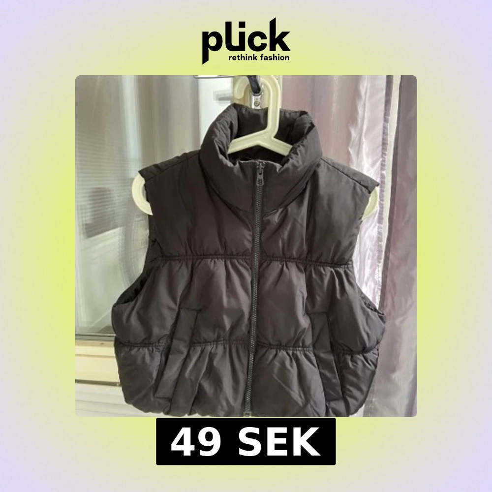 Säljer en svart dunväst från H&M Divided med hög krage och dragkedja framtill. Västen har en puffig, quiltad design och två fickor på sidorna.