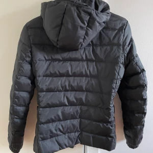 Jacka från Champion i storlek medium. Vadderad med luva, två fickor med knappar och en innerficka med dragkedja. Luvan kan dras åt. Har ett litet hål i fodret i ena fickan.