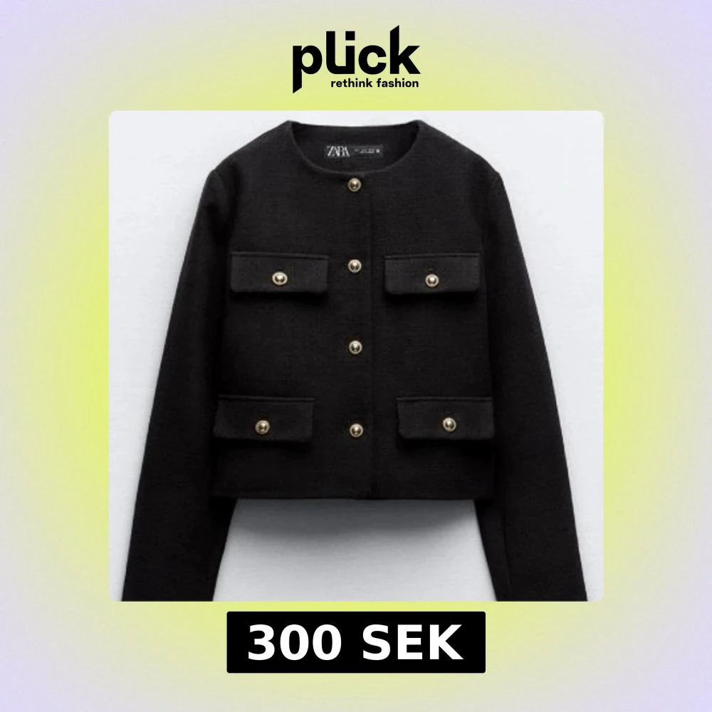 Snygg svart cardigan jacka från Zara med croppad passform med guldknappar. Använd fåtal gånger. Perfekt för att göra outfiten lite mer lyxig