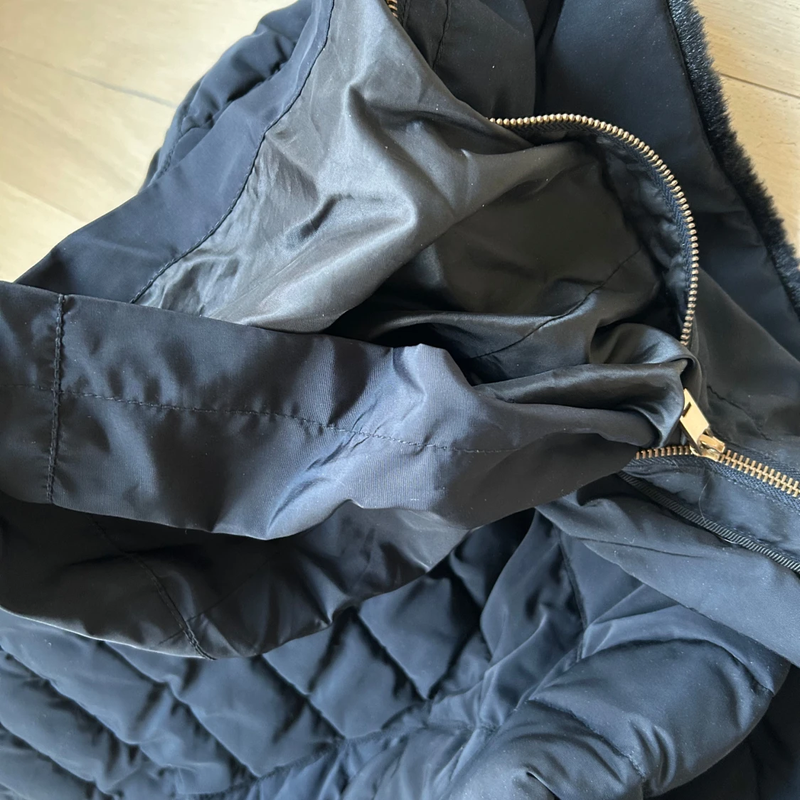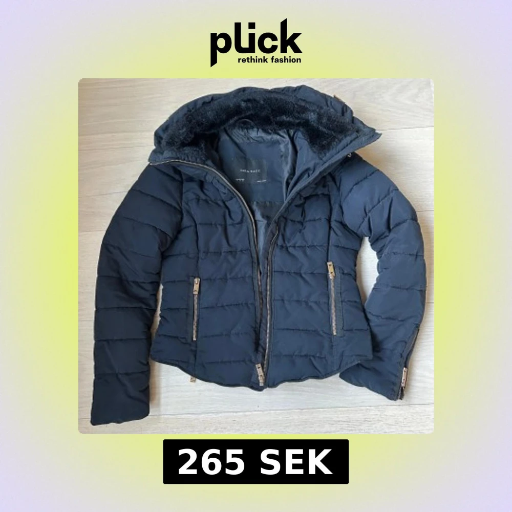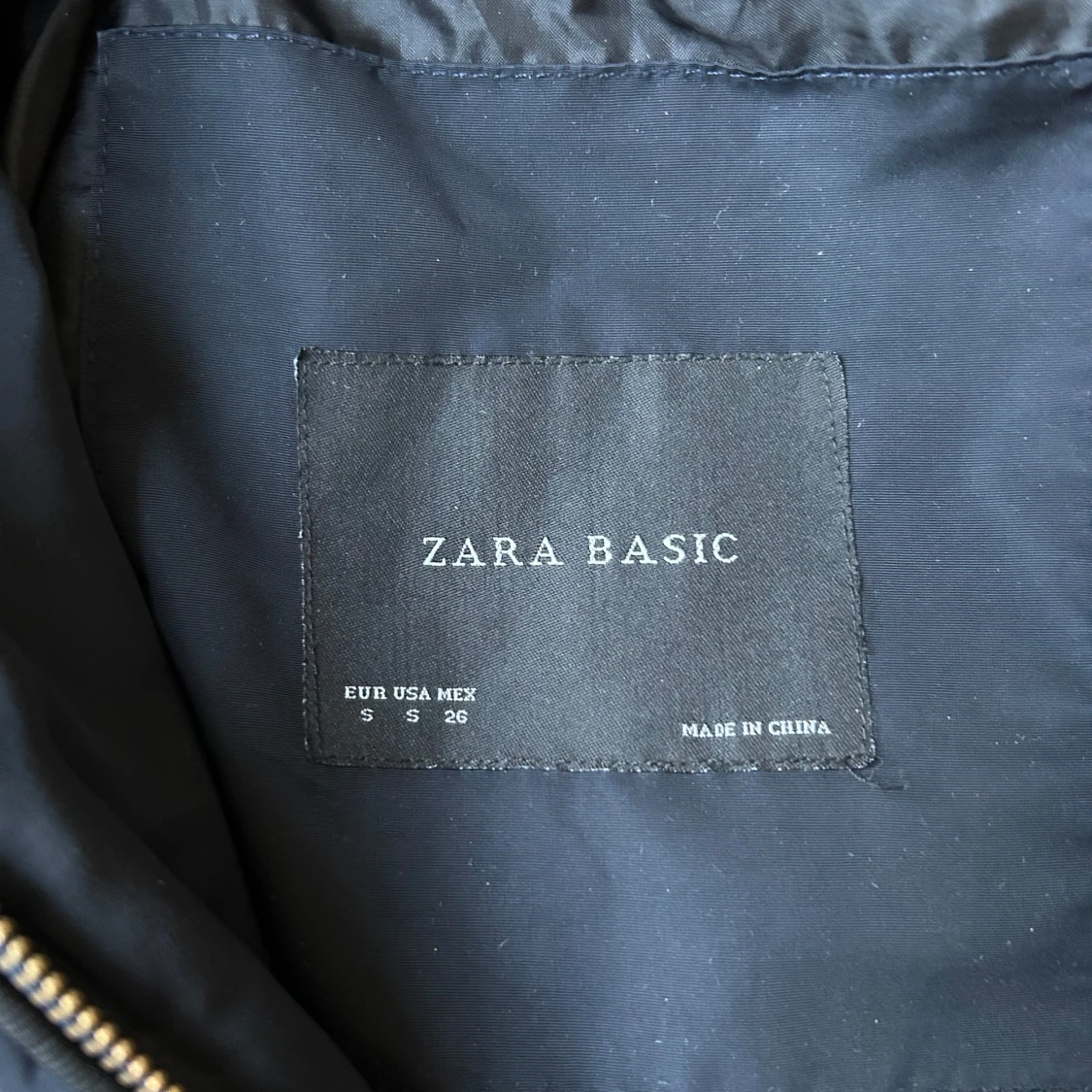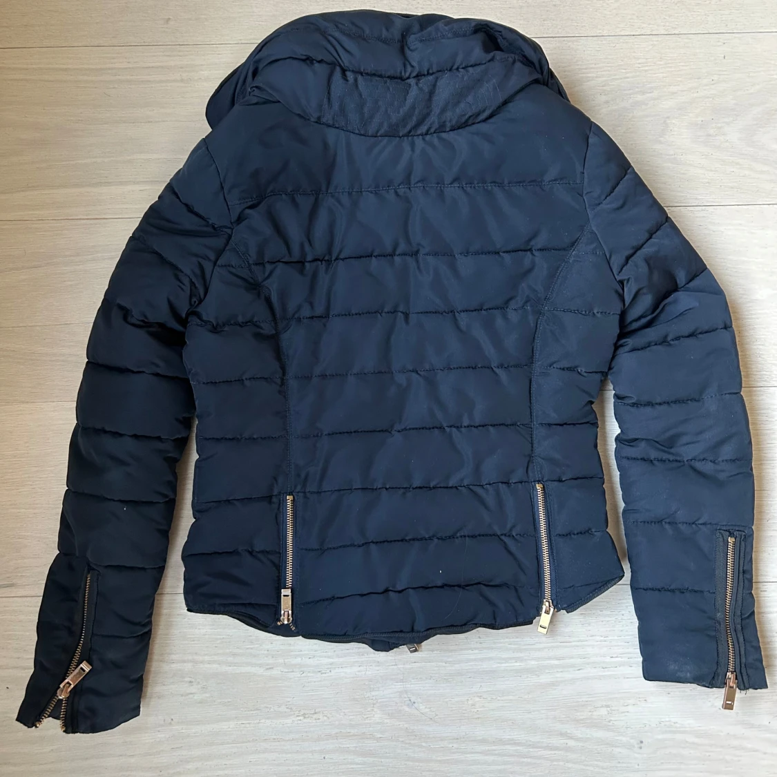 Marinblå pufferjacka från Zara med gömd huva och snygga guldfärgade dragkedjor. Jackan är quiltad och har två fickor framtill samt dragkedjor vid ärmsluten. Perfekt för kyliga dagar och har en stilren, figurnära passform.