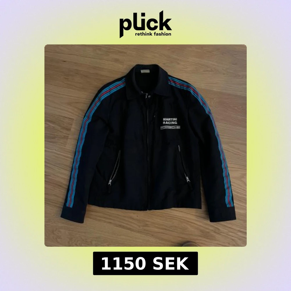 SUPERSKÖNT SVART JACKA. MÅSTE SÄGA ATT DE HAR SMÅ FLÄCKAR SOM EJ GICK BORT I TVÄTTEN. DÄRFÖR DET NEDSATTA PRISET. JACKAN KAN ANDVÄNDAS ISTÄLLET TILL MER SLITSAMMA OUTFITS. Svart jacka från Porsche Design med broderad 'Martini Racing Porsche'-logga på bröstet. Snygga blå och röda ränder längs ärmarna, dragkedja framtill och på fickor. Klassisk krage och sportig vibe, perfekt för dig som gillar racing och streetwear.