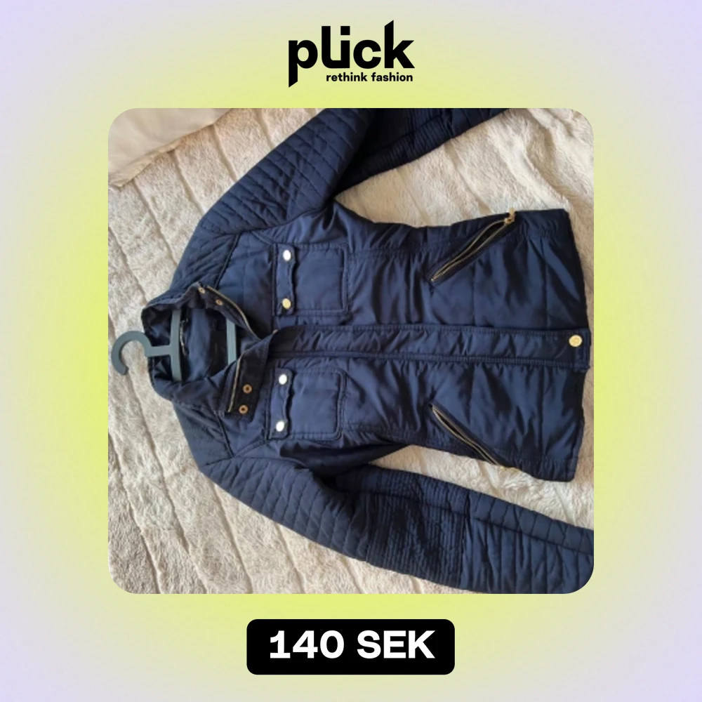 Marinblå jacka från Gina tricot. Köpte den i strl 40 för ha den oversized och de blev snyggt. Praktiskt med fickorna. Inte jättetjock jacka men håller värmen bra. Även vattentålig.