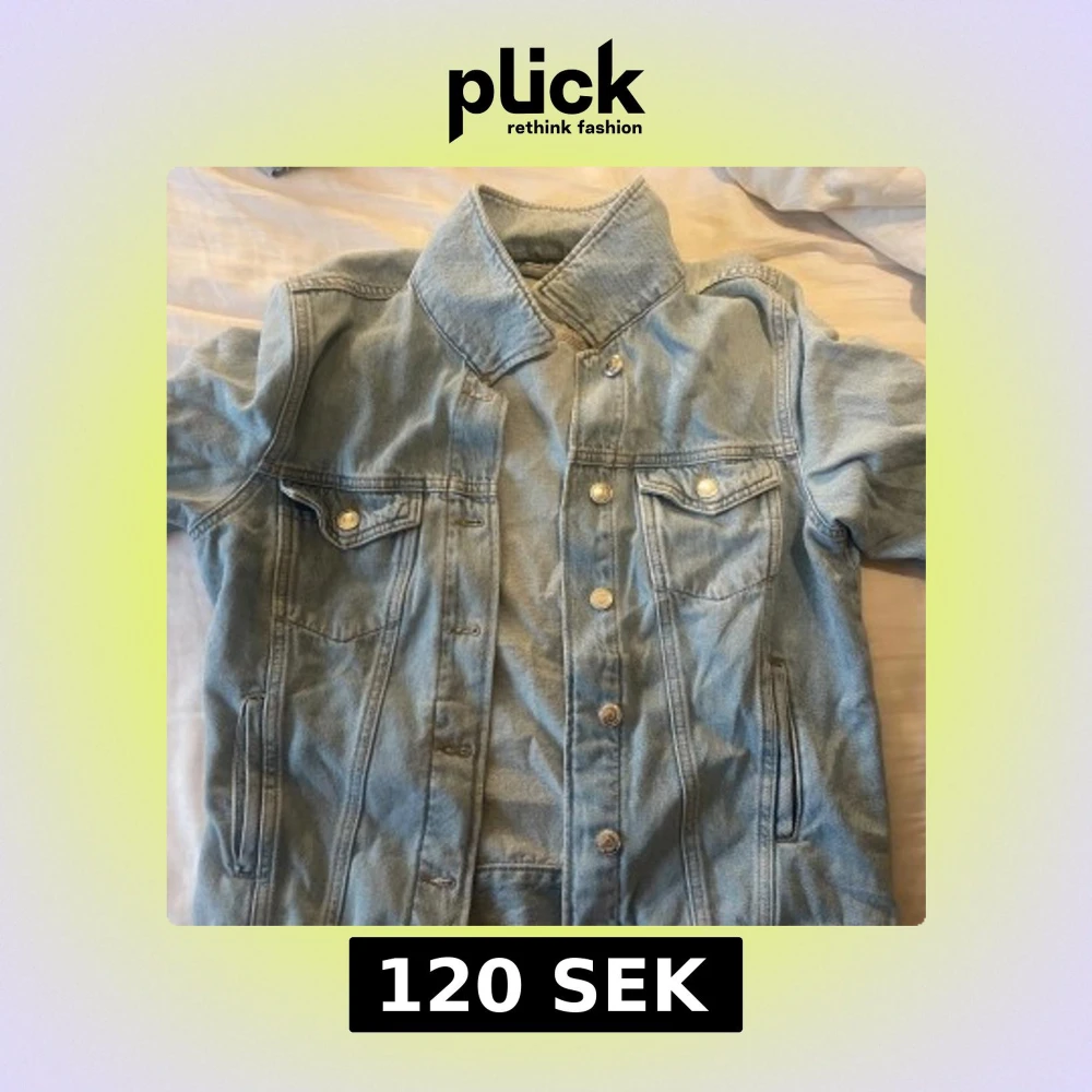 Säljer en ljusblå jeansjacka med snygga silvriga knappar och två bröstfickor framtill. Jackan har en unik volangdetalj på ryggen som ger en extra touch. Klassisk krage och raka sömmar, perfekt för dig som vill ha en chill men ändå trendig look.