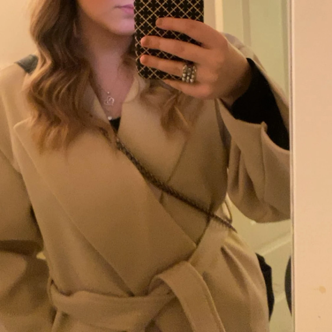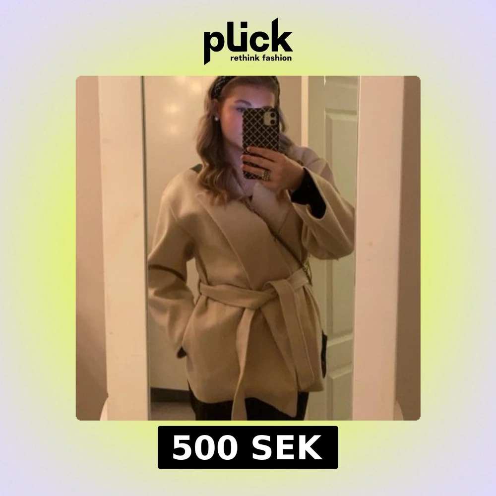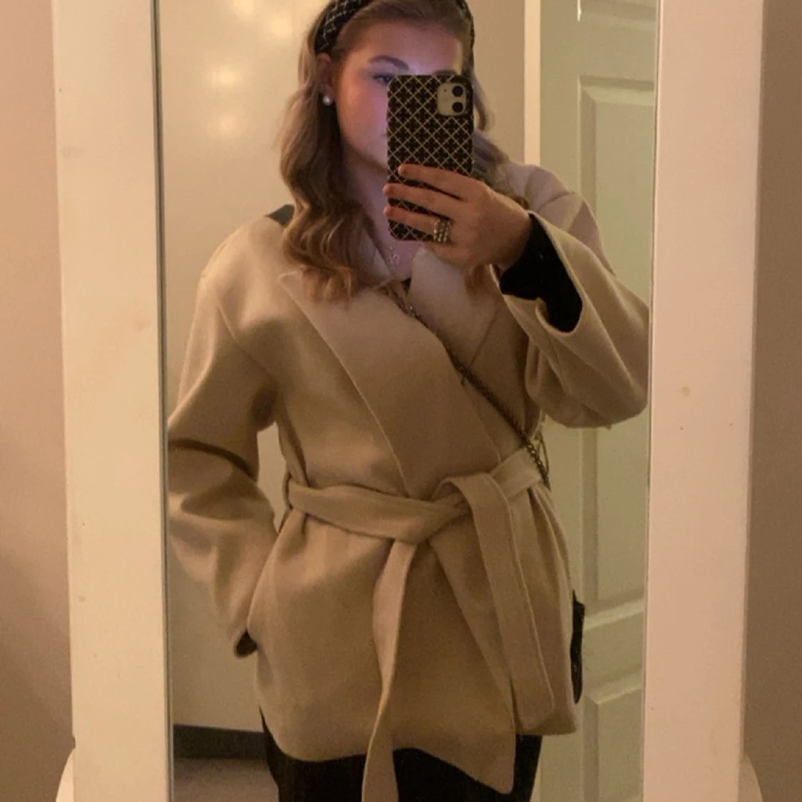 Säljer en beige kappa i omlottmodell med bälte i midjan. Jackan har en stilren och enkel design med långa ärmar och mjukt material. Perfekt för dig som gillar en clean och trendig look.