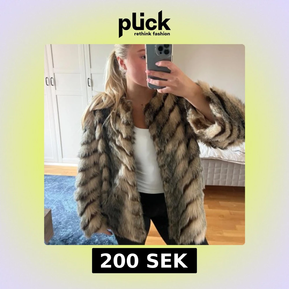 Säljer en fluffig pälsjacka i bruna och svarta toner med tydliga diagonala ränder. Jackan har en loose passform och långärmad. Materialet är pälsimitation och jackan är riktigt mjuk och varm. Jackan är i storlek L men skulle mer säga att den är en M, jag är 160cm för referens.