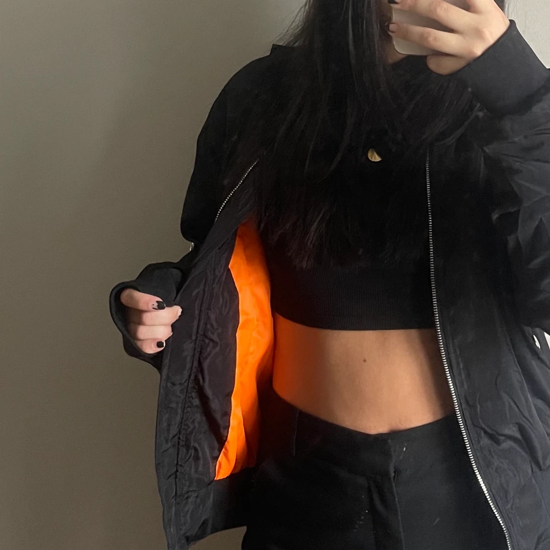 Oanvänd bomberjacka ifrån Nelly.com med tags kvar, ej kommit till användning då det ej är min stil. Orange fodring och liite oversized!
