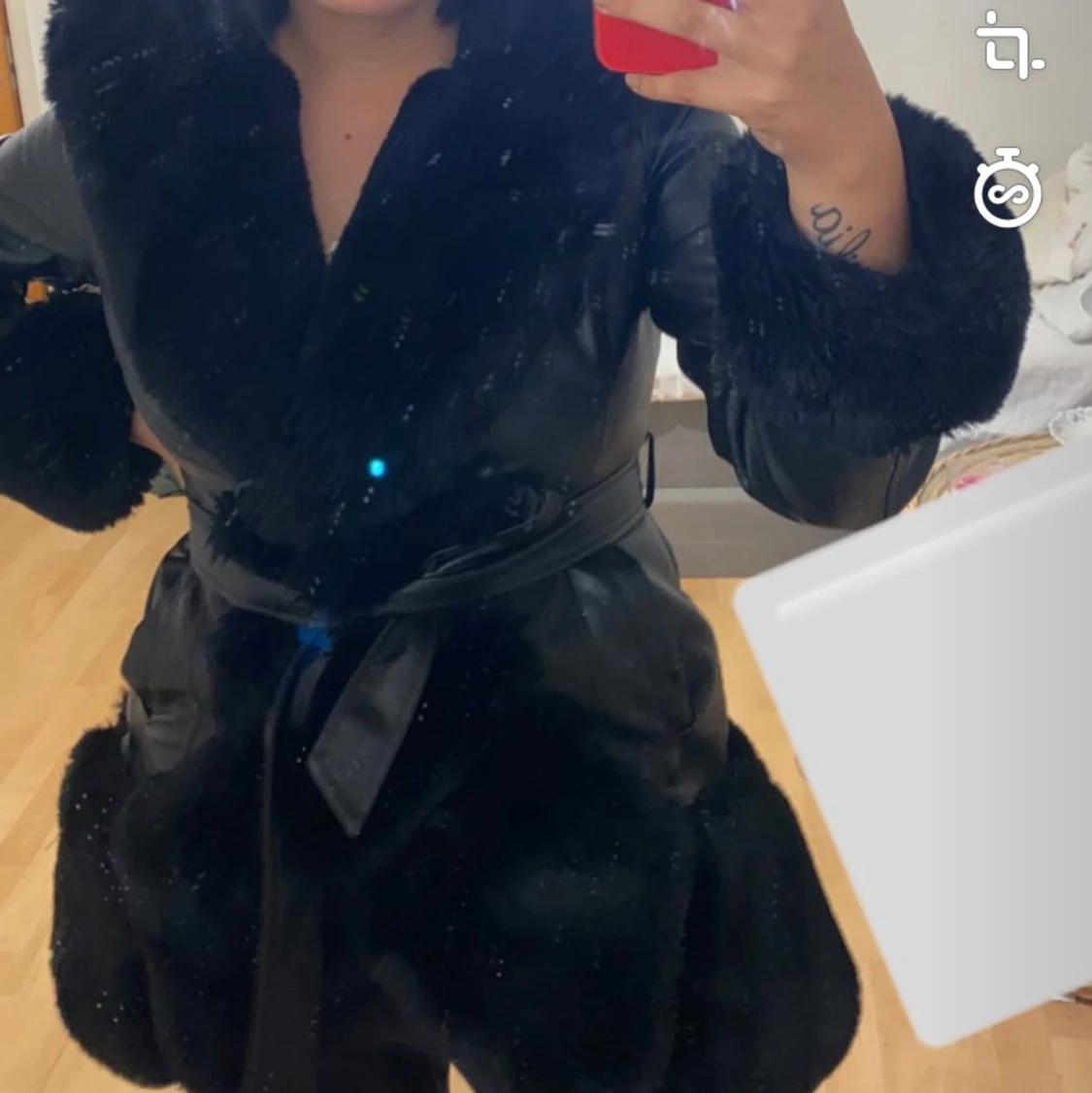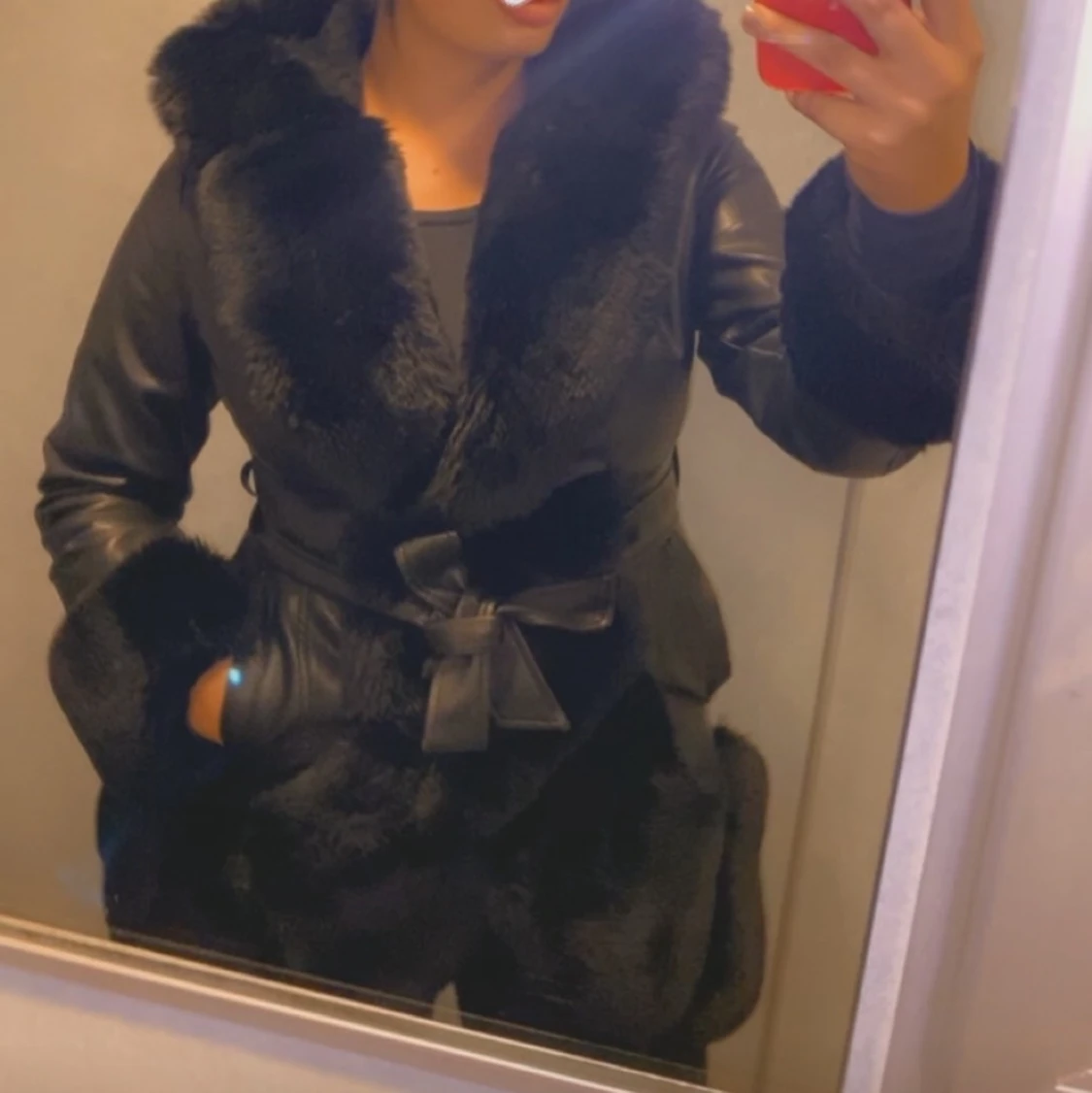 En jätte fin höst kappa i fake skinn med pälsdetaljer och knytband vid midjan, endast använd i våras ca 2 månader. Dock inte dagligen använd under den perioden. Storlek M