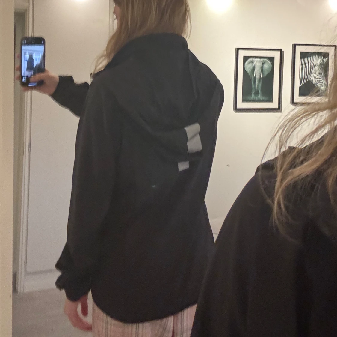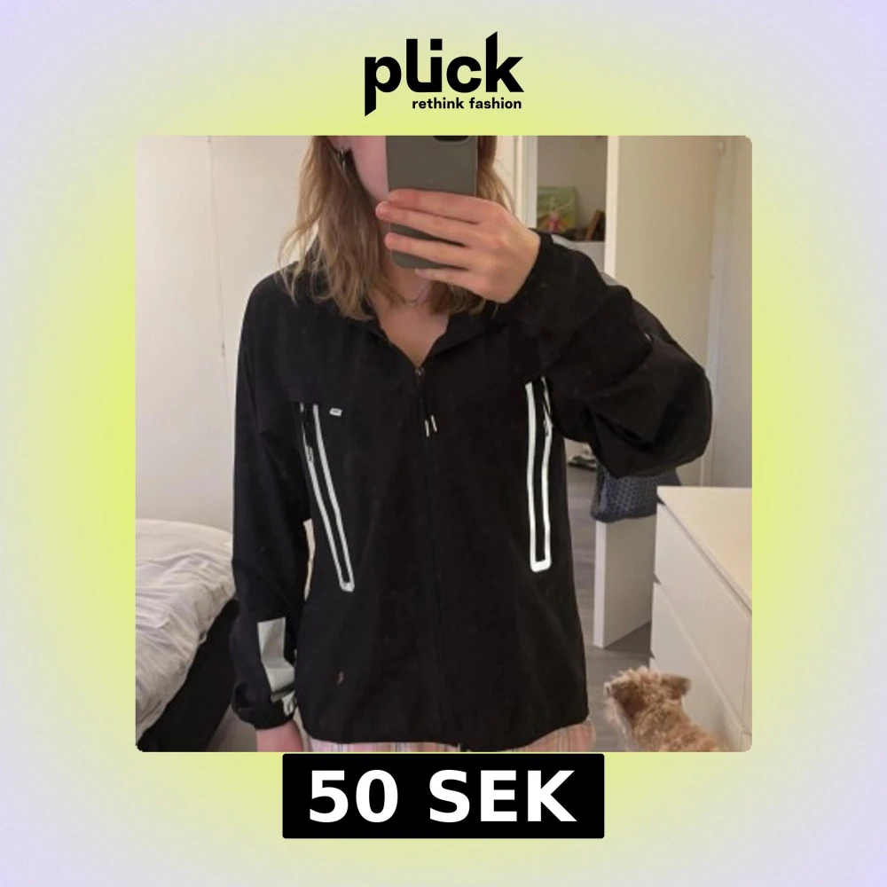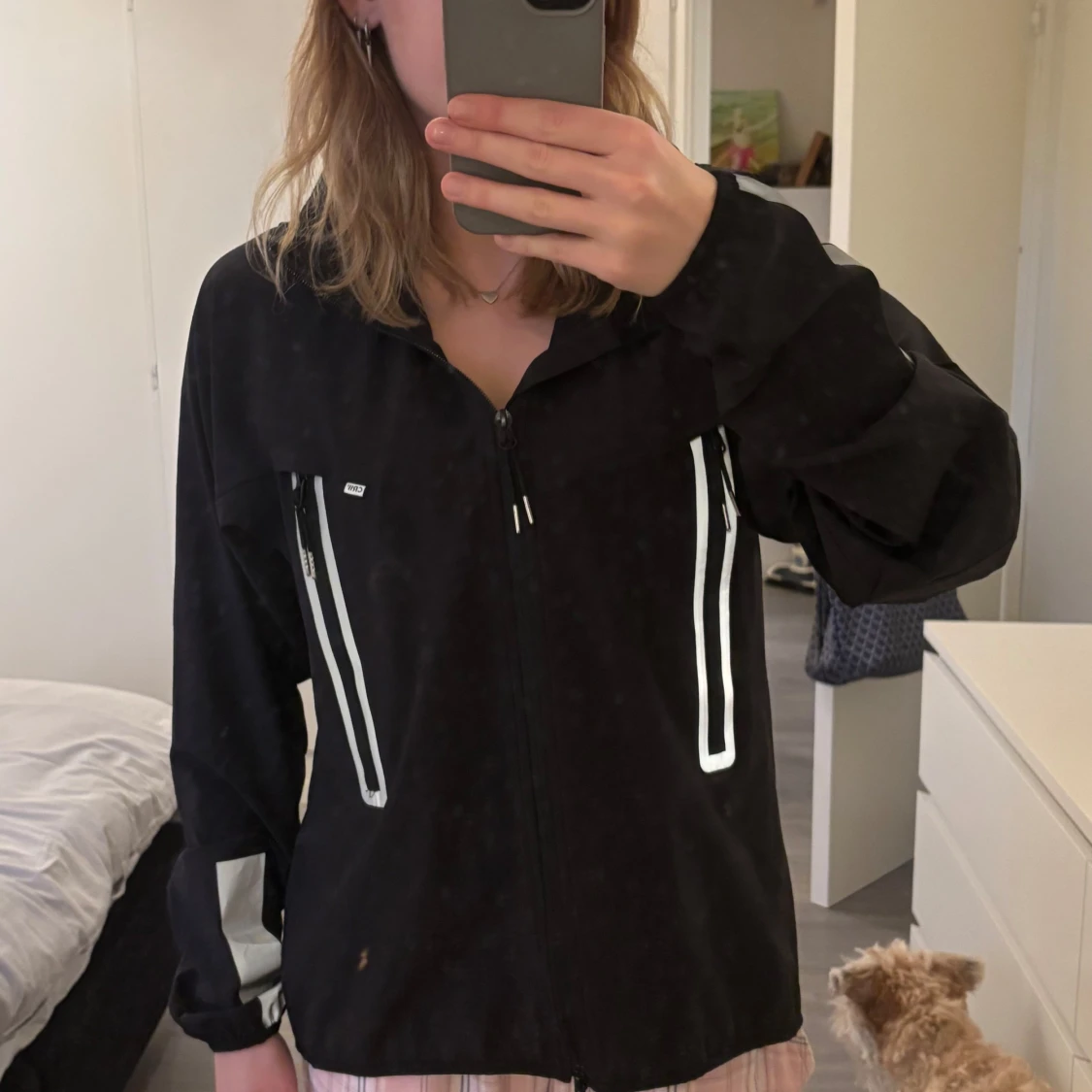 Köpt från hööks tror jag, väldigt tunn, perfekt att rida i nu till hösten, storlek S, man får lätt plats med en tjockare tröja under, har även en hätta man kan ta av om man vill. Kan användas som vanlig jacka oxå. Tror aldrig använd