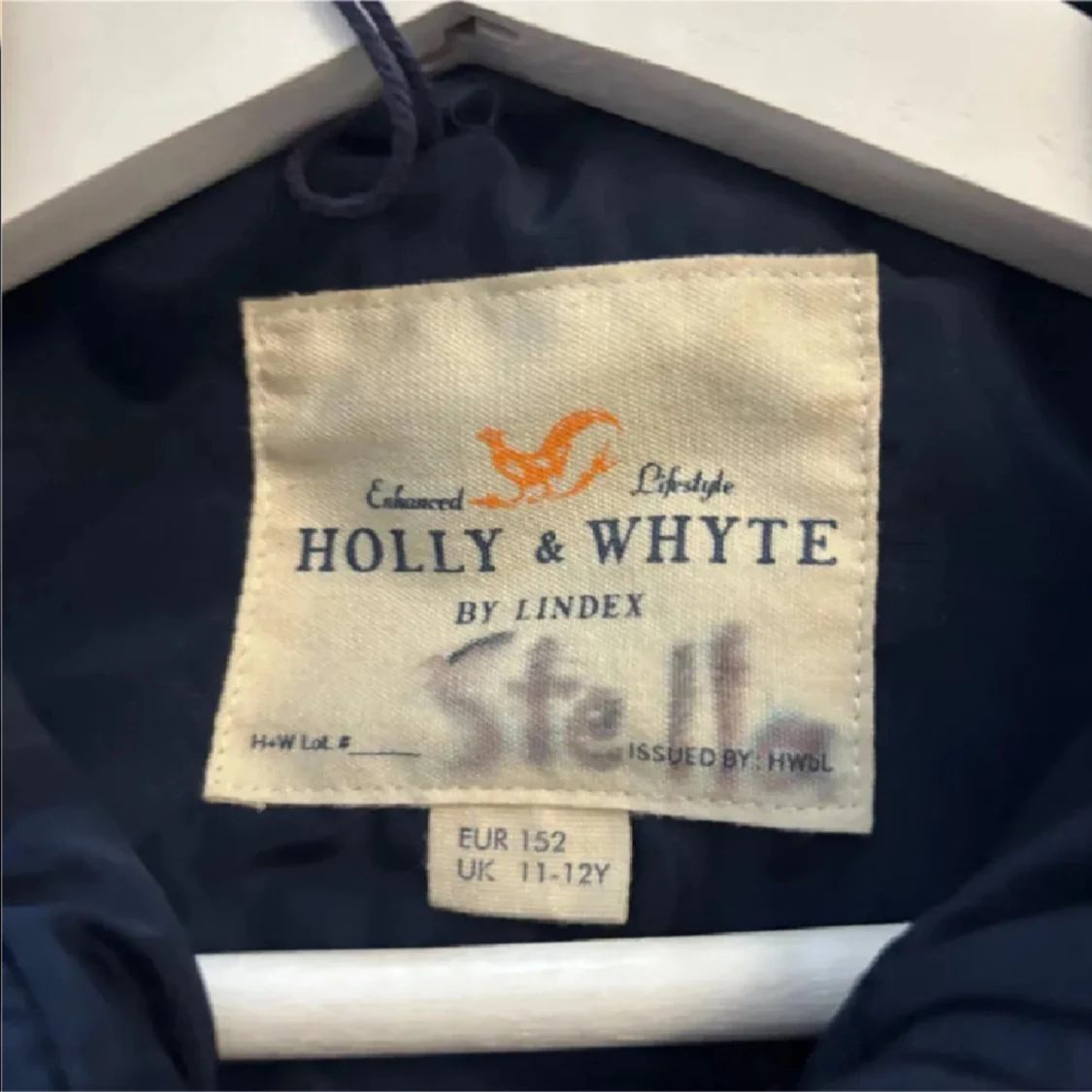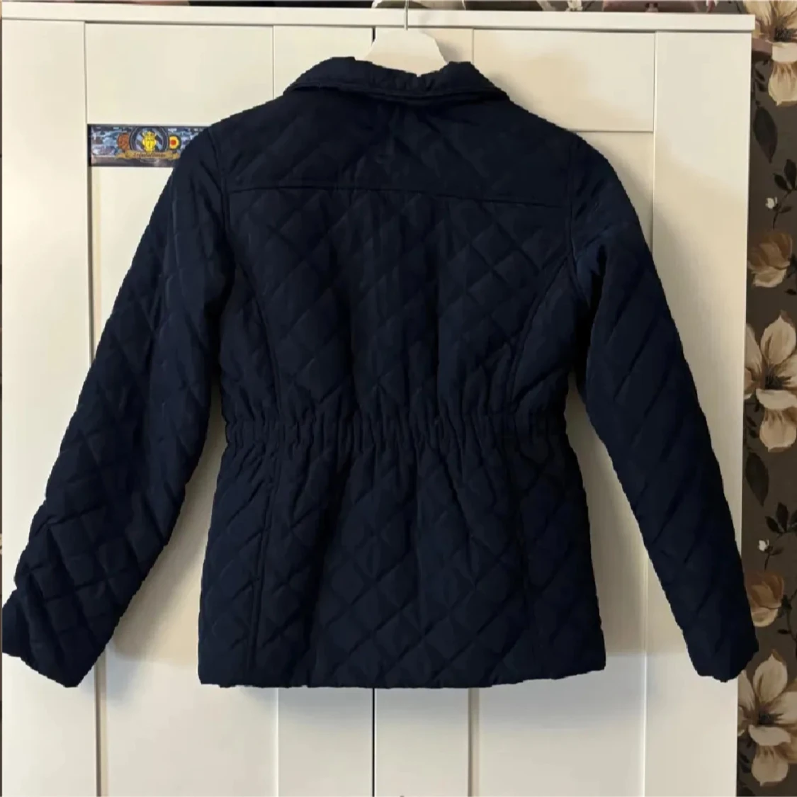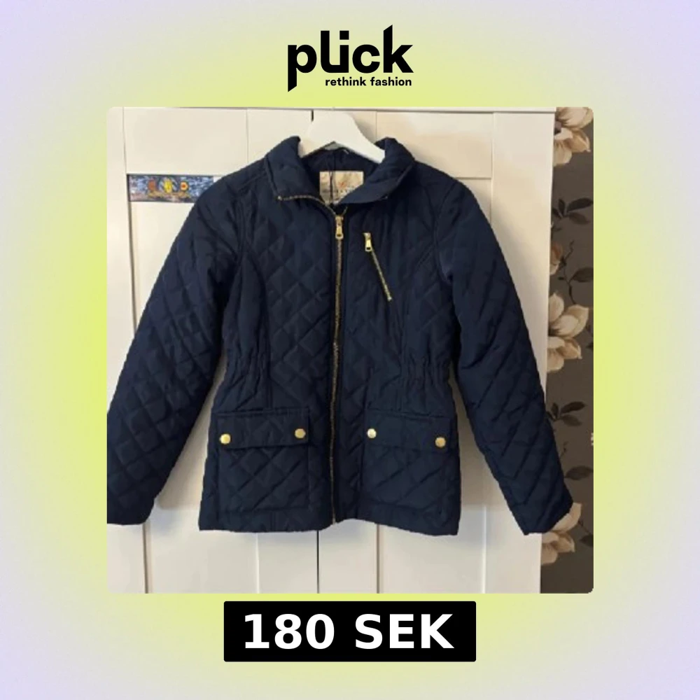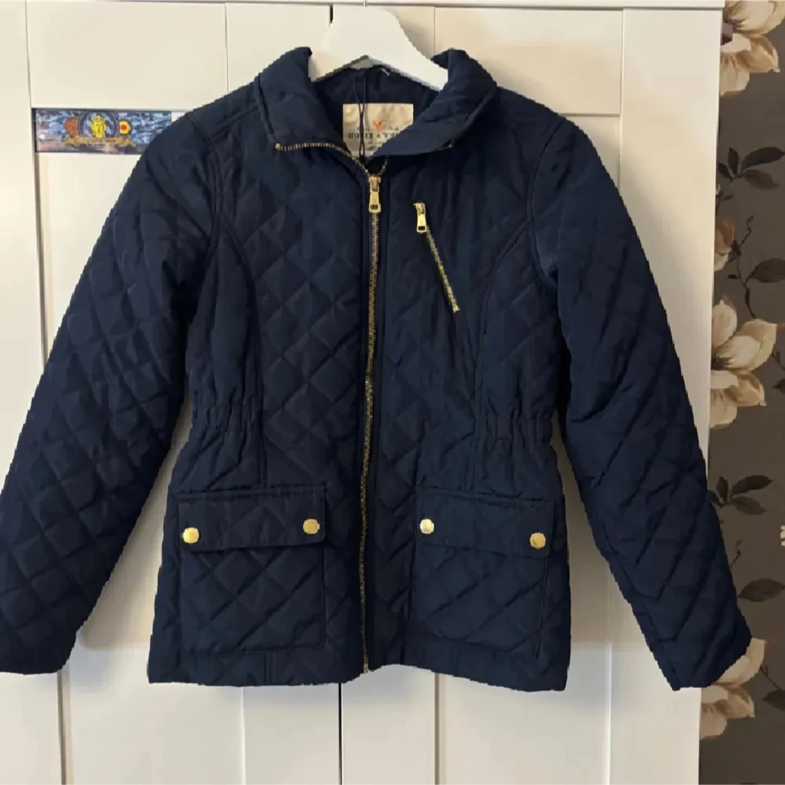 Quiltad mörkblå jacka från Holly & White med guldfärgade dragkedjor och knappar. Jackan har två stora fickor framtill, en sned bröstficka med dragkedja och markerad midja. Perfekt för dig som gillar stilen och klassisk look. Sår Stella på insidan av jackan. Skriv för fler bilder!