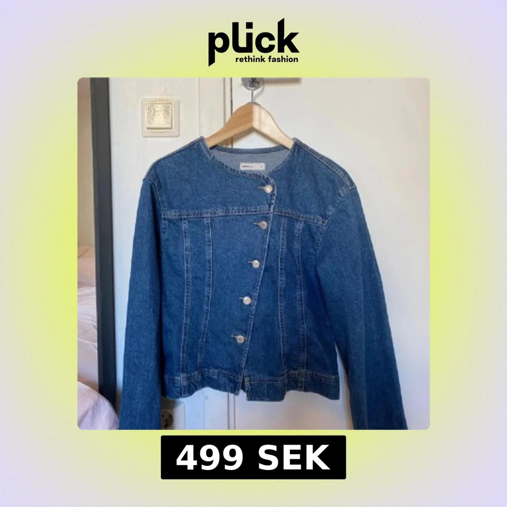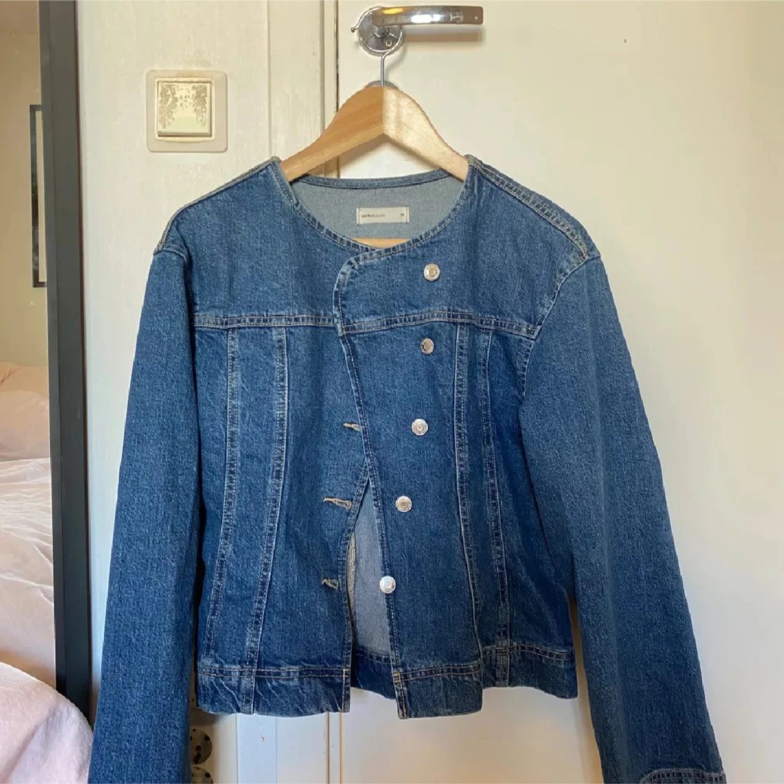 Snygg jeansjacka i klassisk blå denim från från gina . Jackan har en unik asymmetrisk knäppning med silvriga knappar och rundad halsringning. Långärmad modell med raka linjer och cool, modern känsla. Perfekt för dig som vill sticka ut lite extra.