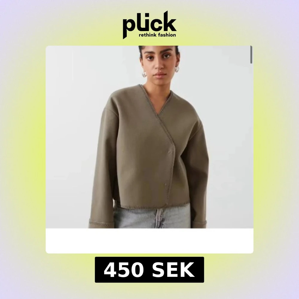 Säljer en beige cardigan jacka med v-ringning och dekorativa sömmar längs kanterna. Koftan har lång ärm och en loose passform, perfekt att slänga på sig över ett linne eller t-shirt. Enkel och stilren design som funkar till det mesta. Har ett litet märke vid armen men syns knappt