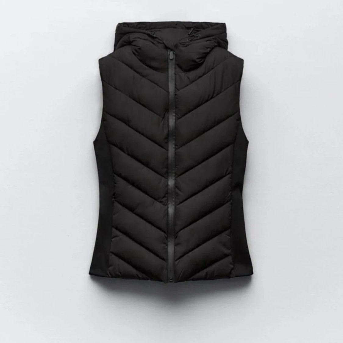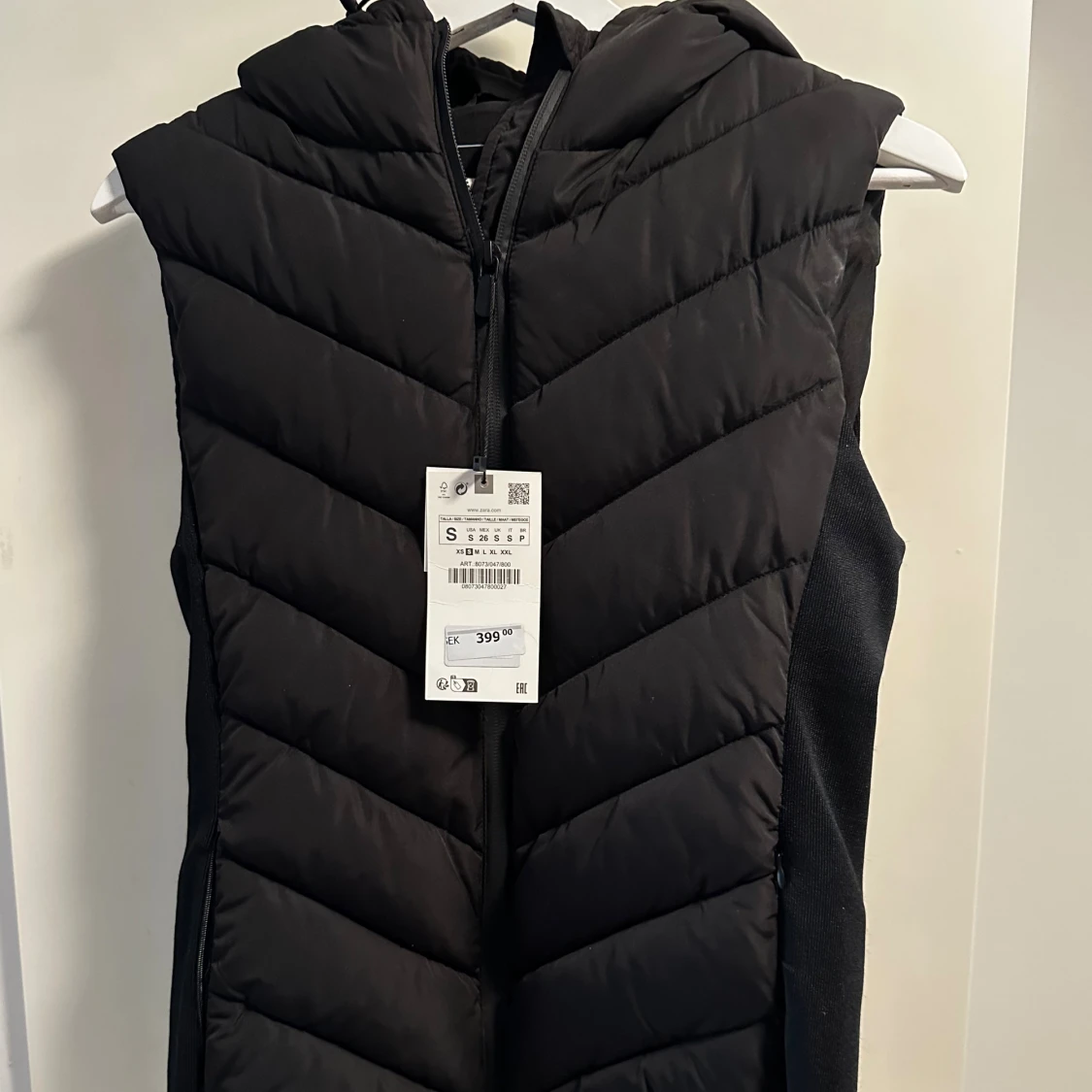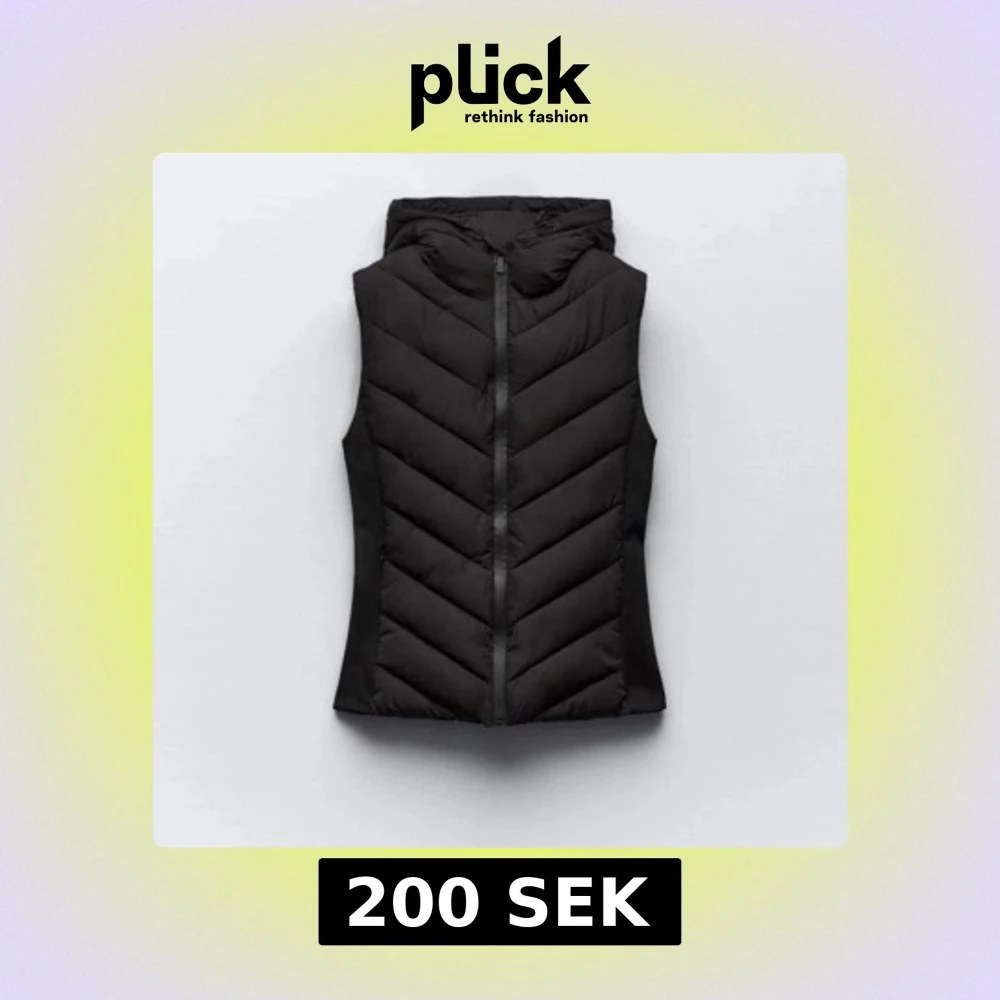 Svart dunväst från Zara med huva och dragkedja framtill. Västen har en figurnära passform och är perfekt för lager-på-lager-stil. Pris går att diskutera💕