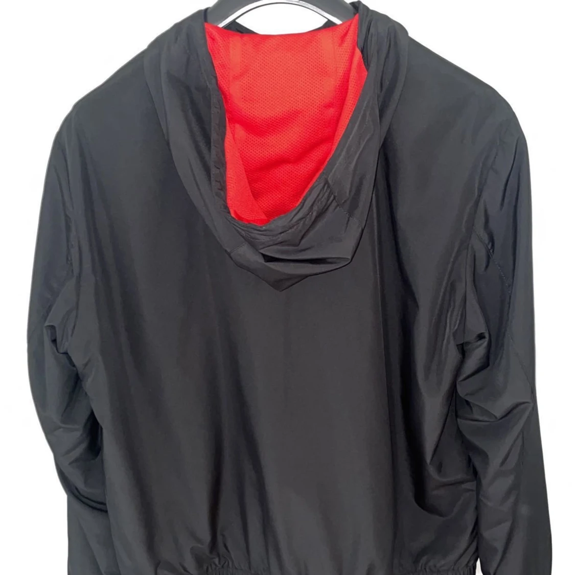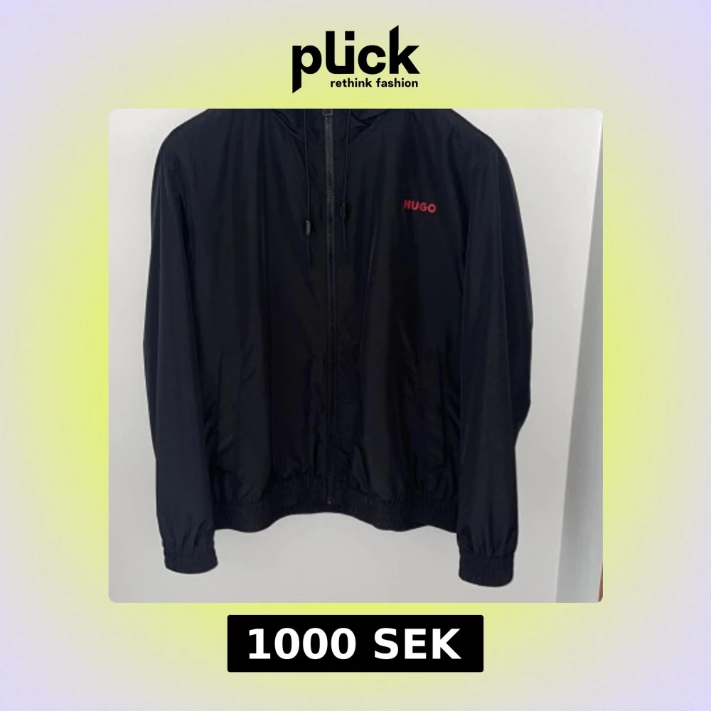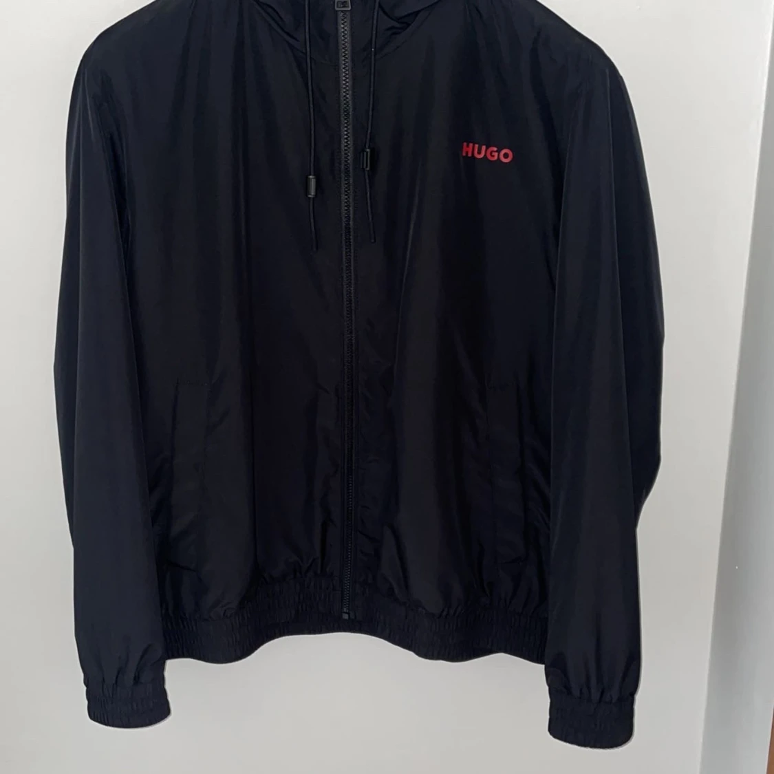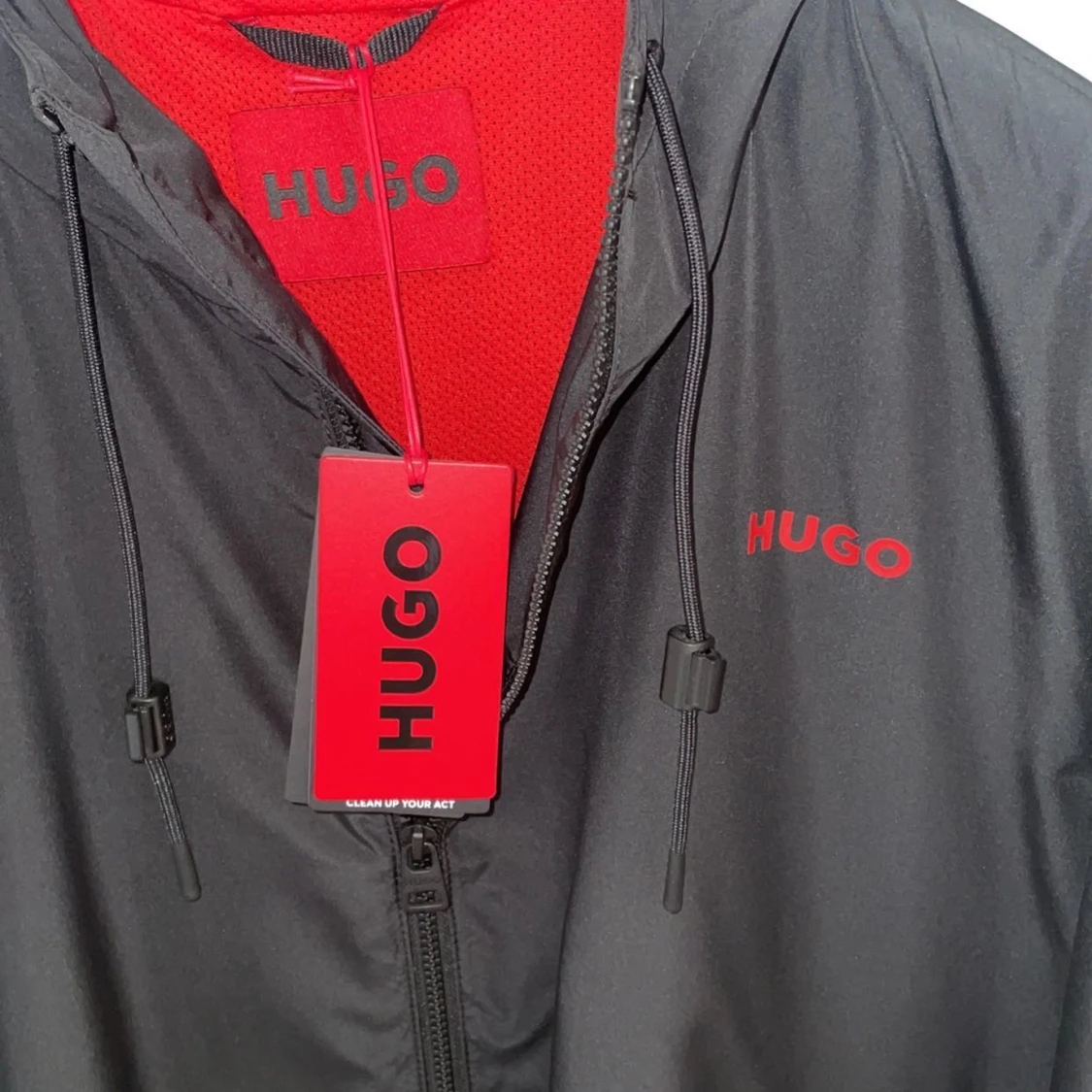 Svart vindjacka från Hugo med röd logga på bröstet och röd meshfoder på insidan av huvan. Jackan har dragkedja framtill, huva med dragsko och elastiska muddar vid ärmslut och midja. Perfekt för blåsiga dagar.