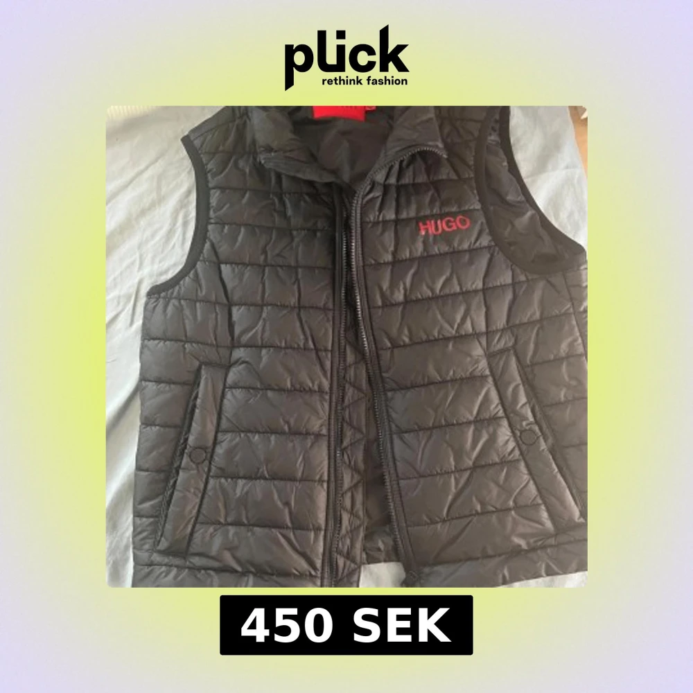 Snygg svart quiltad dunväst från Hugo Boss med röd HUGO-logga på bröstet. Västen har dragkedja framtill, två fickor med knappstängning och en hög krage. Perfekt för lager-på-lager och ger en clean streetstyle-vibe.