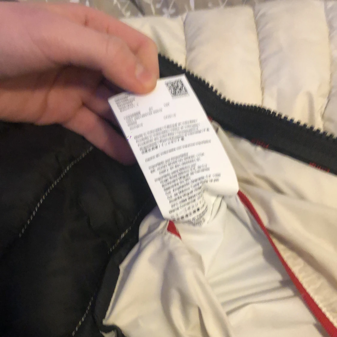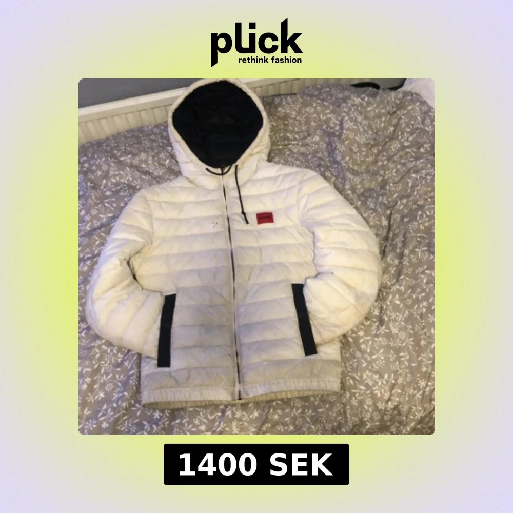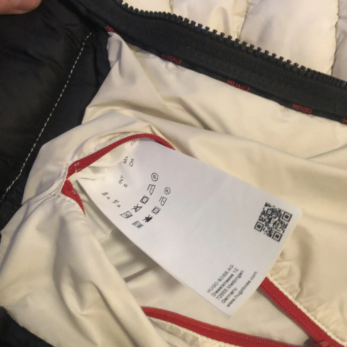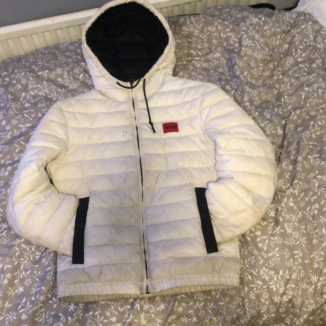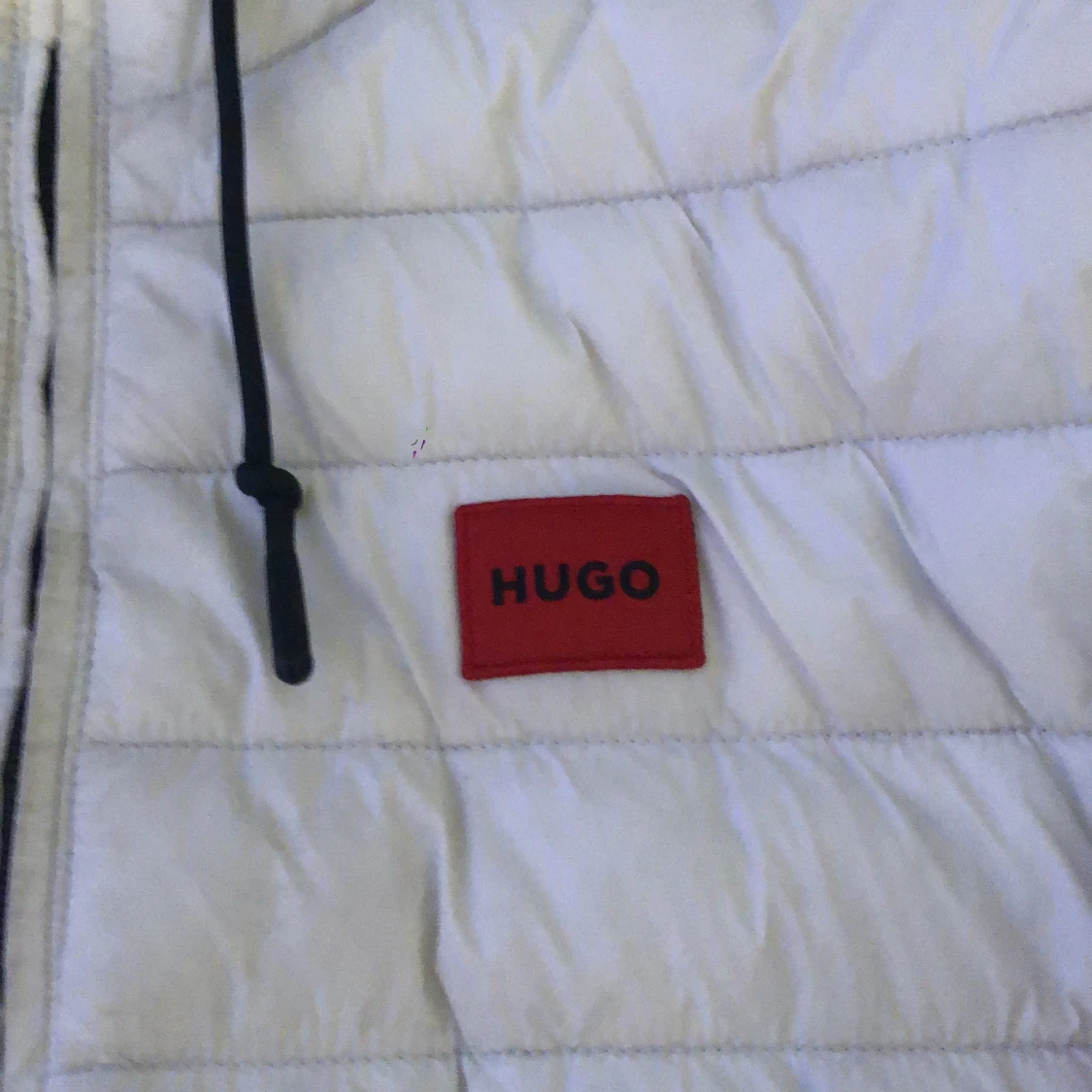 Säljer en stilren vit dunjacka från Hugo med svart foder och huva. Jackan har en dragkedja framtill och en röd logotyp på bröstet. Perfekt för kyliga dagar.
