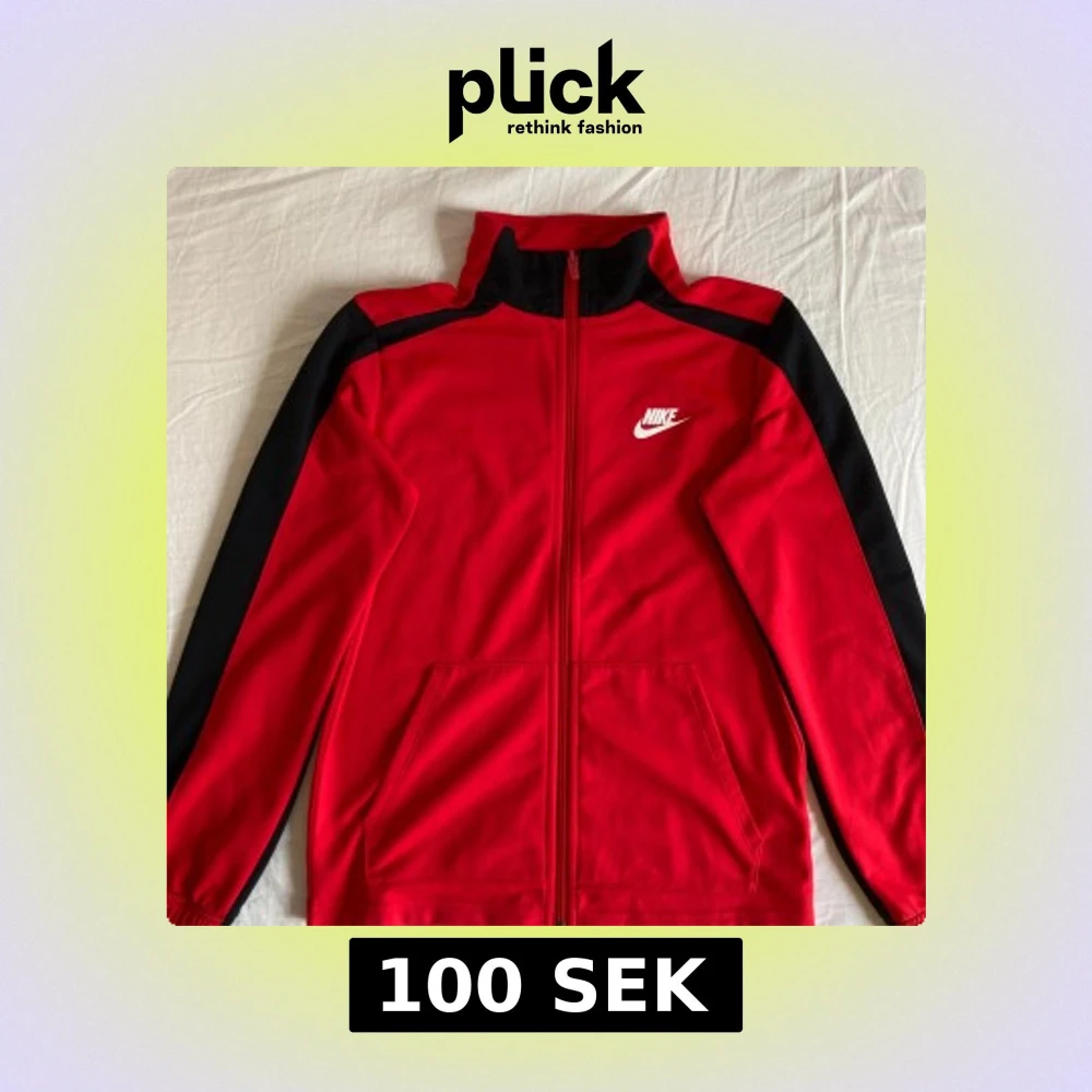 Nike vindjacka i rött med svarta ärmar och detaljer. Jackan har hel dragkedja, hög krage och två fickor framtill. Stor Nike-logga på ryggen och mindre logga på bröstet. Liten i modellen, skulle säga en XS/S