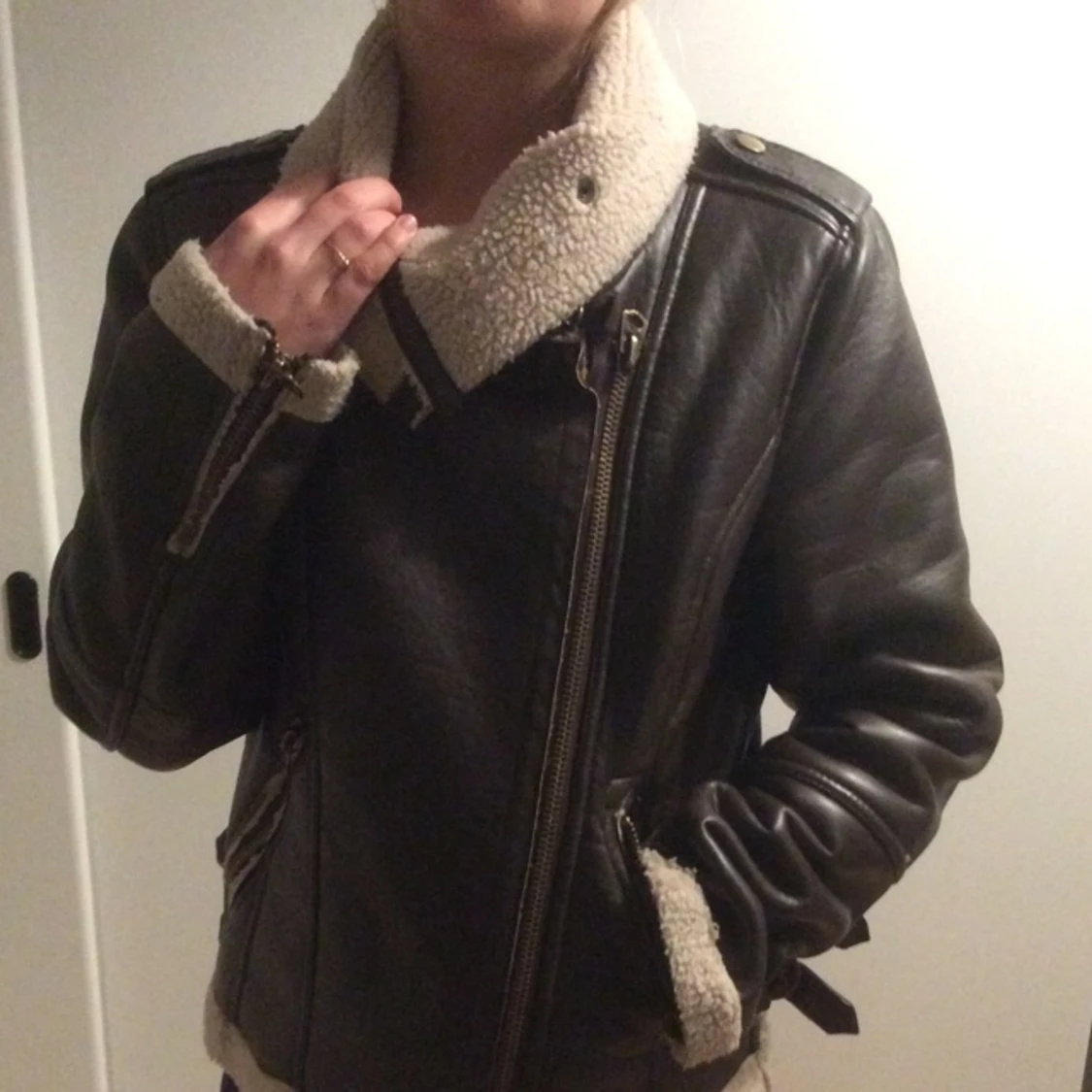 Varm fodrad jacka i brunt imitationsskinn. Passar S om man vill ha plats för tjock tröja under men på lappen står det strl M. Använd men i bra skick, lite trasig vid dragkedjan men det är inget man ser eller tänker på (se bild) , annars är det lätt fixat.