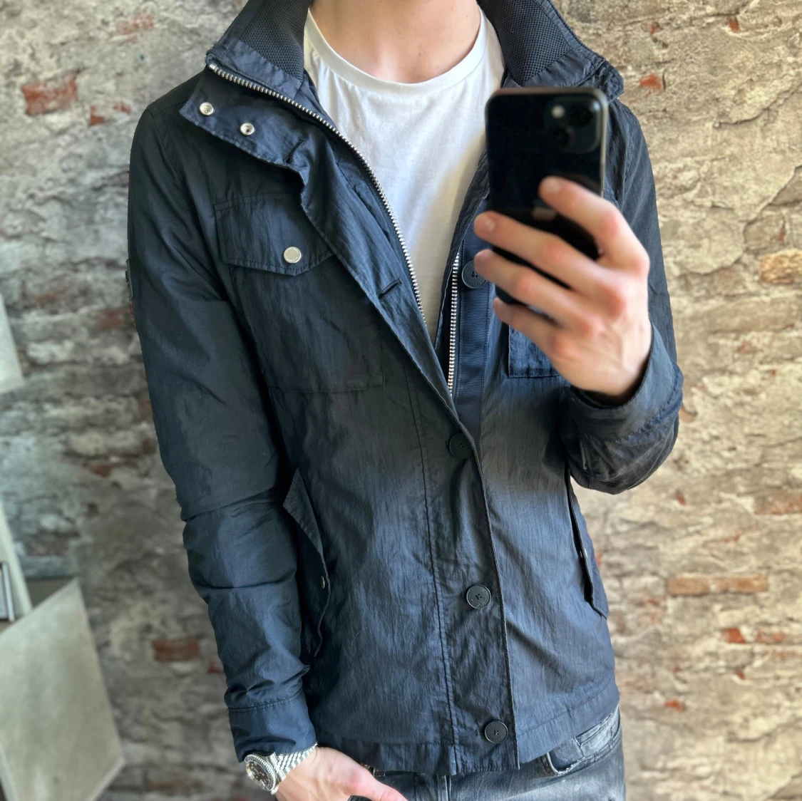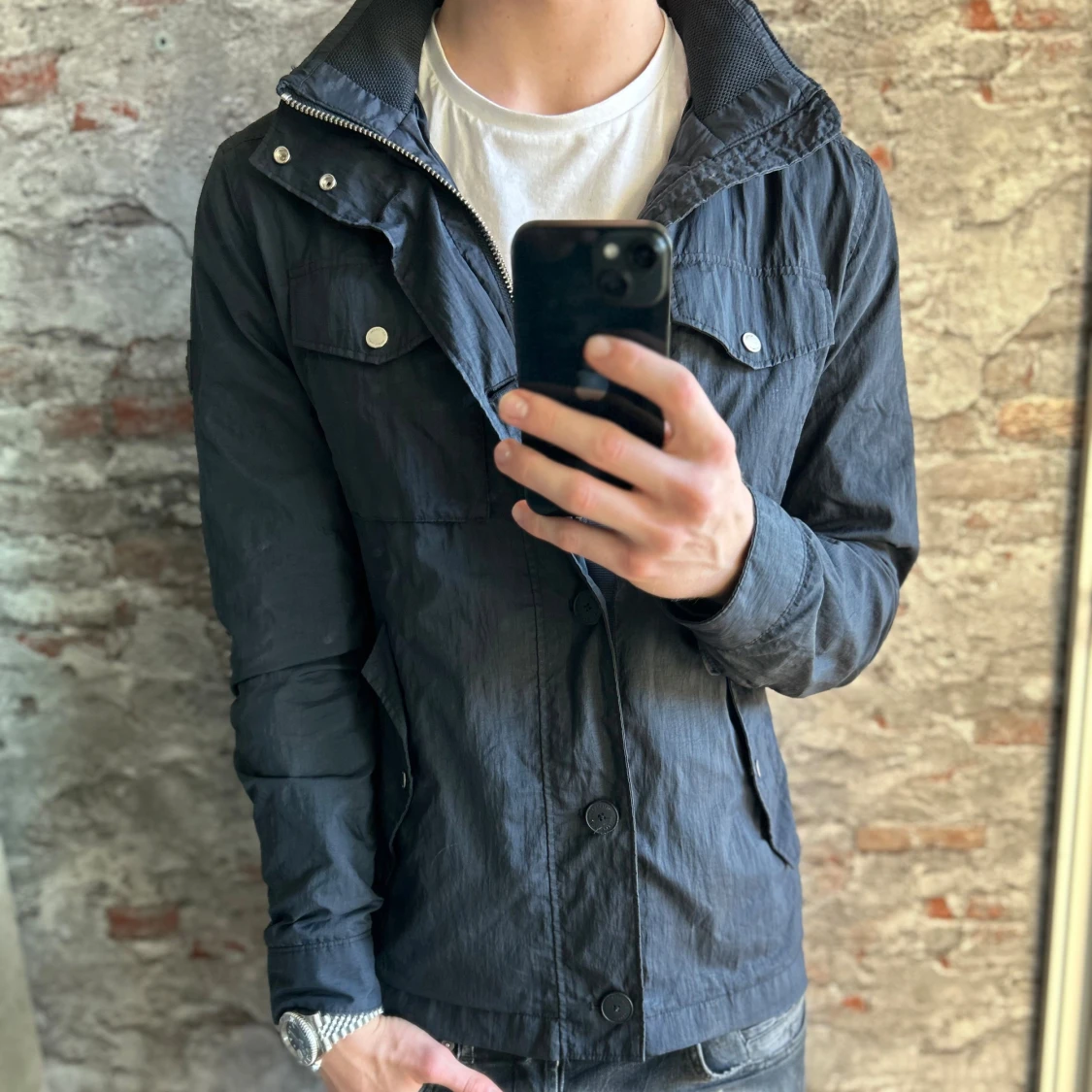 Bra skick, smutsig på sina ställen men annars bra. Storlek M passar dig som är mellan 175-185cm ungefär. Nypris ca 4000kr. Modellen är 185 cm, 79 kg. Passar bra nu till regn och vid. Skriv för mer information!🤝