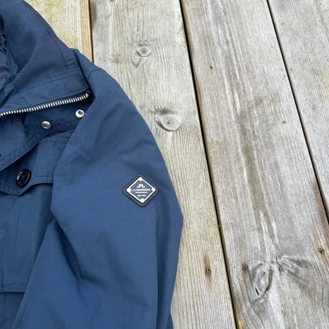 Snygg marinblå field jacket från J.Lindeberg med dragkedja och knappar framtill, två stora bröstfickor och hög krage. Jackan har en stilren look med diskret logotyp på ärmen och är tillverkad i lätt polyester. Perfekt för höst och vintern.