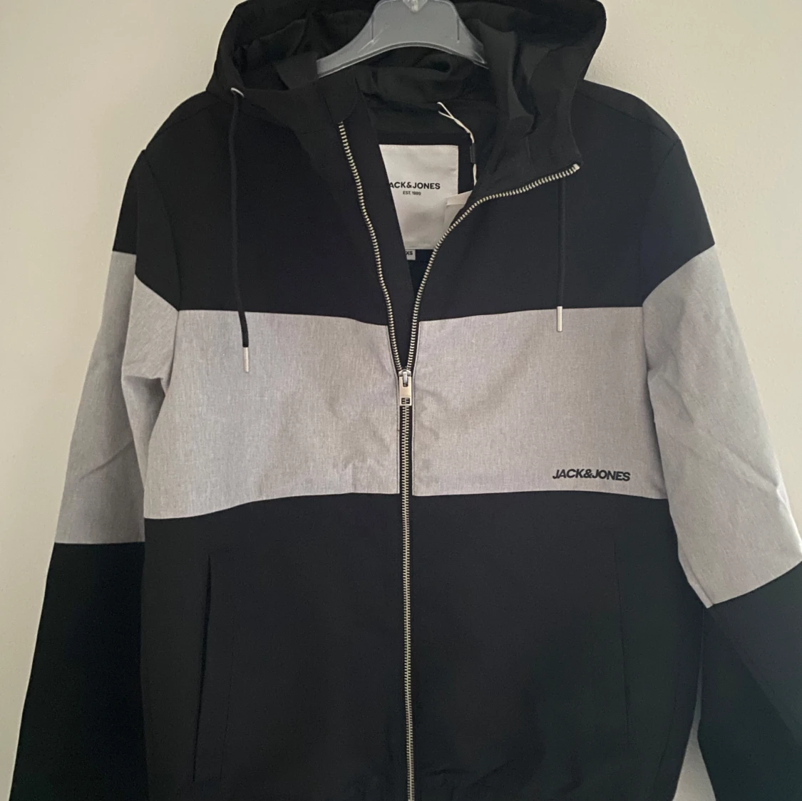 Säljer en svart/grå windbreaker från Jack and Jones. Den är helt ny och i perfekt skick. Storlek är xs och hör av er vid frågor.