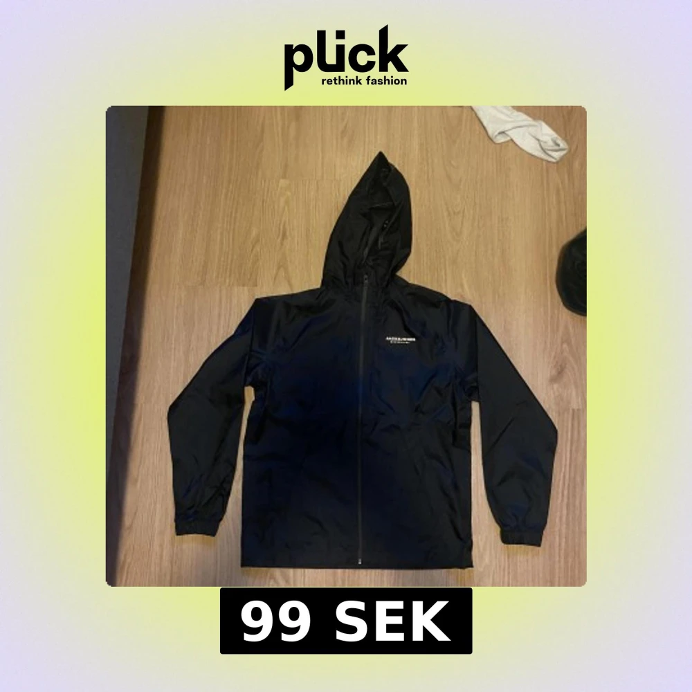 Säljer en svart vindjacka från Jack & Jones med huva och dragkedja. Jackan har elastiska muddar vid ärmslut och tryckt logga på bröstet och ryggen. Perfekt för blåsiga dagar och enkel att matcha med det mesta.
