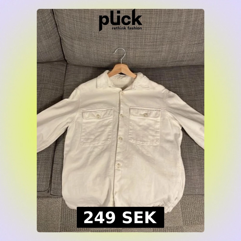 Säljer en stilren vit overshirt med två stora bröstfickor och knappar framtill. Skjortjackan har klassisk krage och är långärmad. Perfekt att slänga över en t-shirt för en clean look.